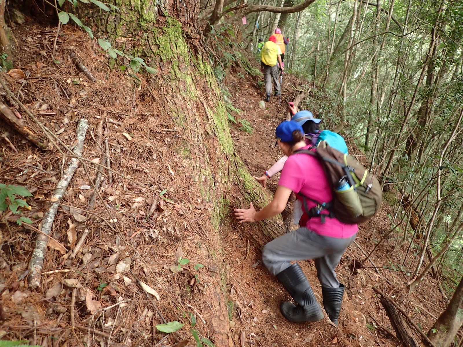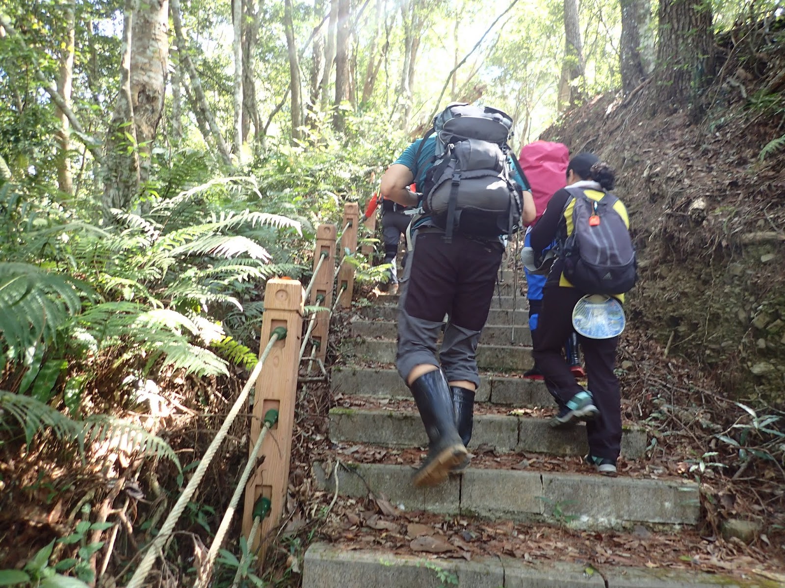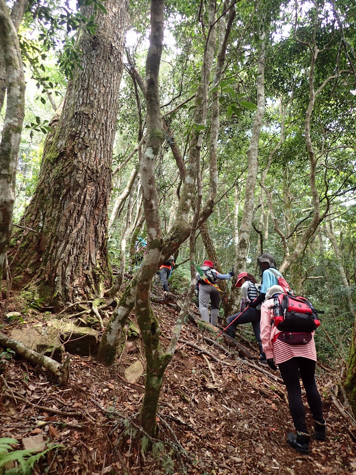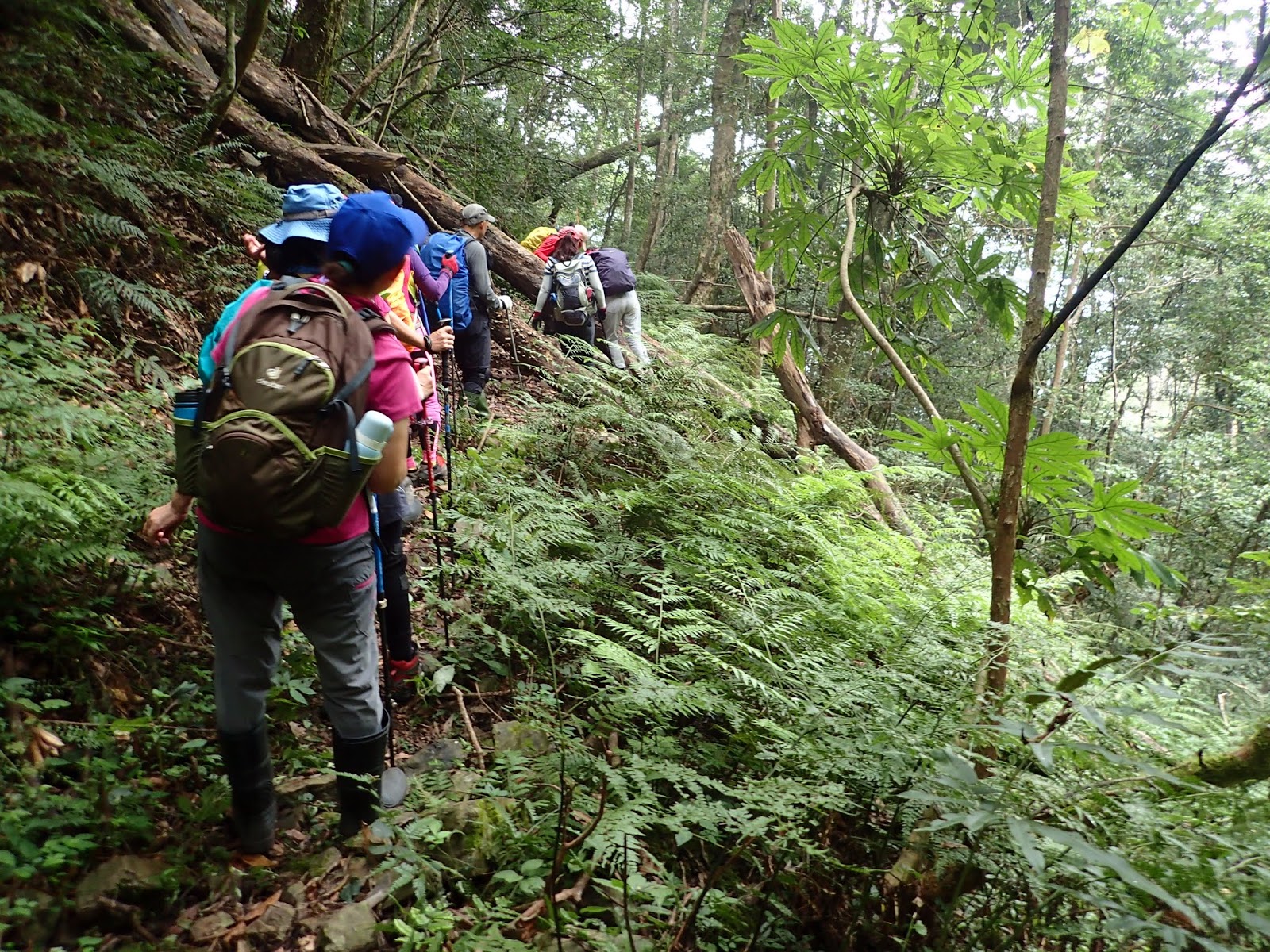 登山口的高度大約700公尺, 一路陡上至芝生毛台山是1789公尺, 落差超過1000公尺, 可想而知回程就是陡下了, 單想就腿軟, 領隊帶我們走一條新闢的山路, 路跡不是很明顯也不好走