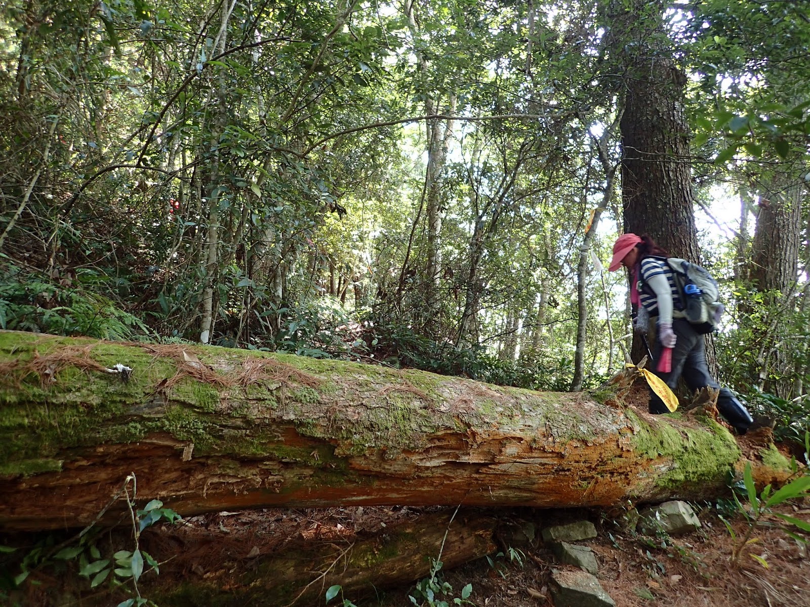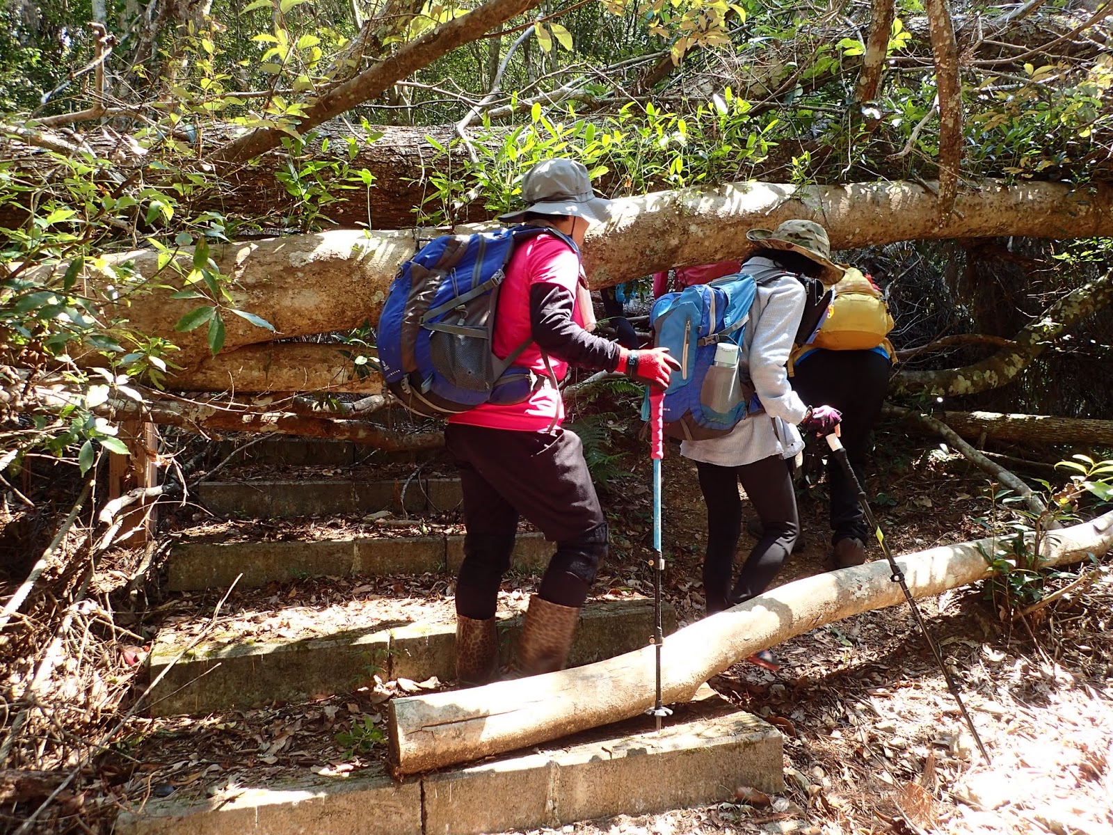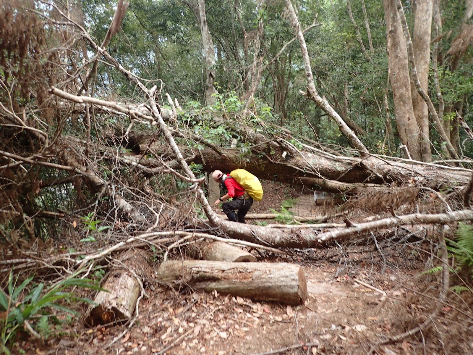 階梯上倒木橫生必須彎腰通過, 走在前頭的是$$及可愛的小百合