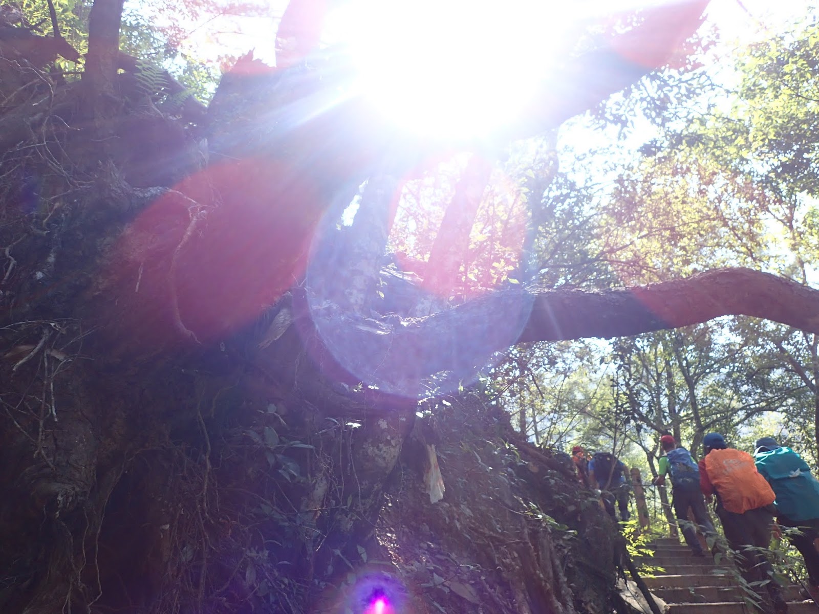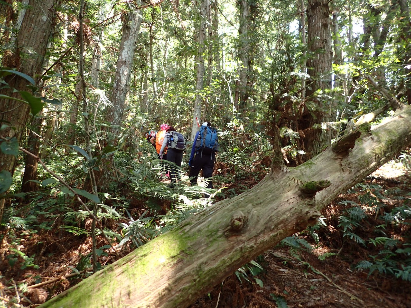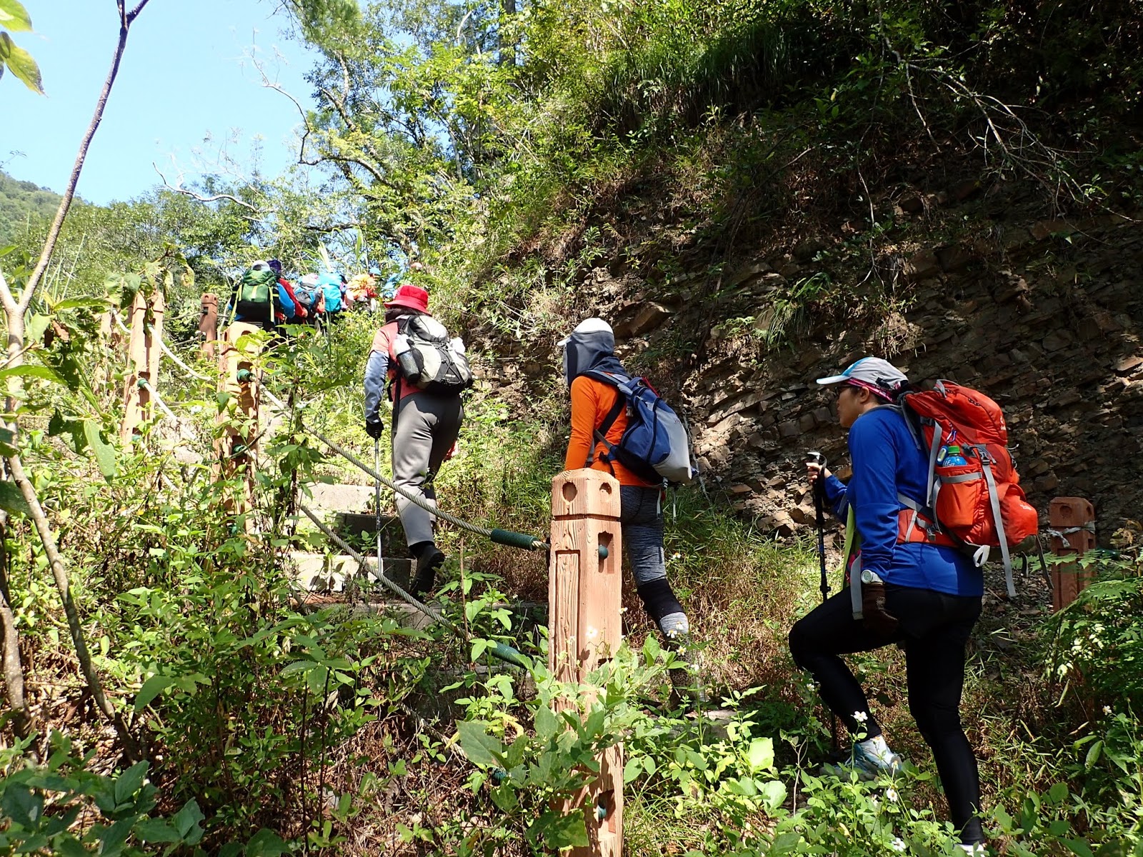 階梯上倒木橫生必須彎腰通過, 走在前頭的是$$及可愛的小百合
