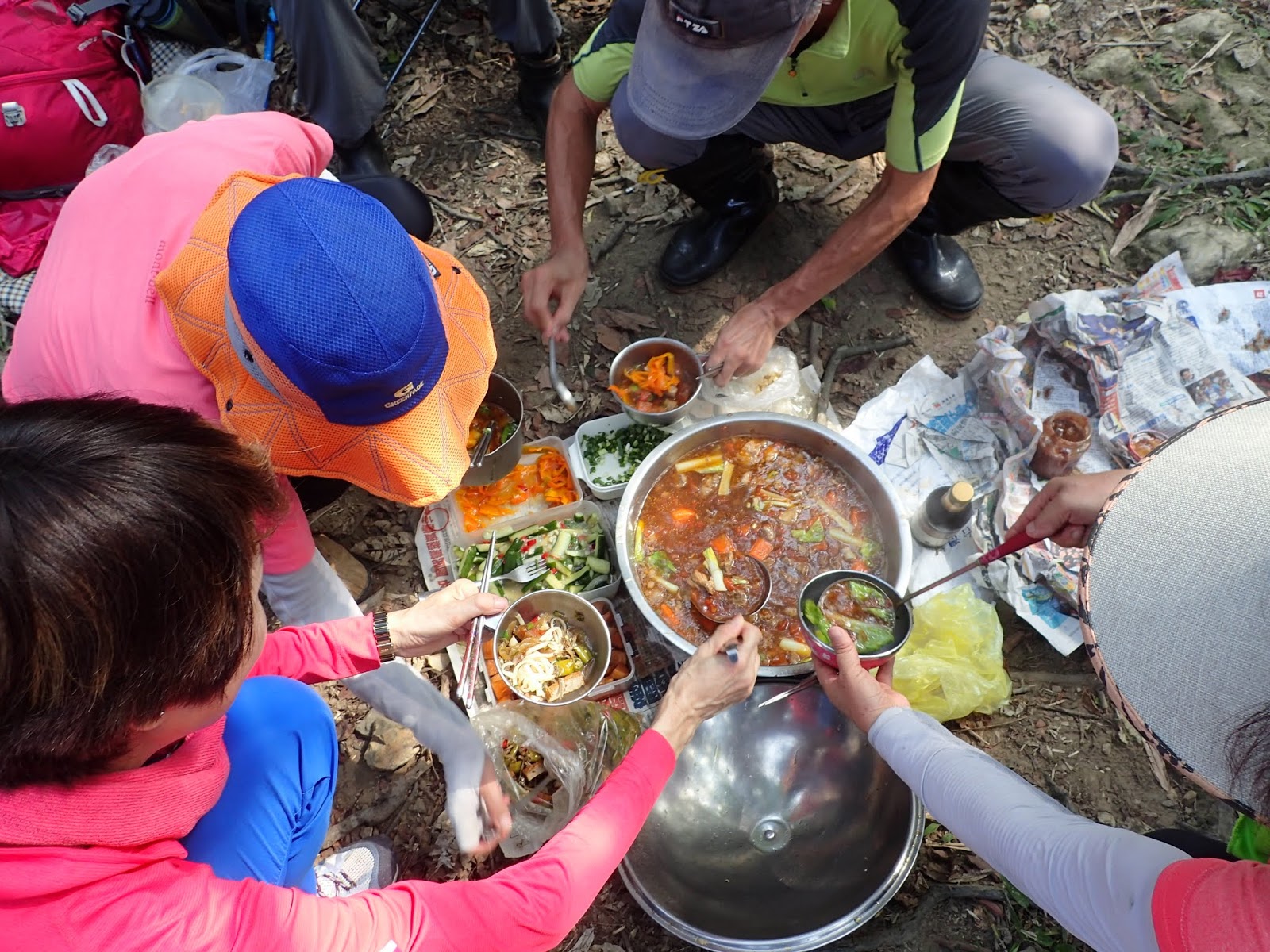 旁邊還有其他山友準備的小菜, 甜湯...只能說參加基哥隊真的好幸福, 落後的基哥及敏雄哥久久後才到...