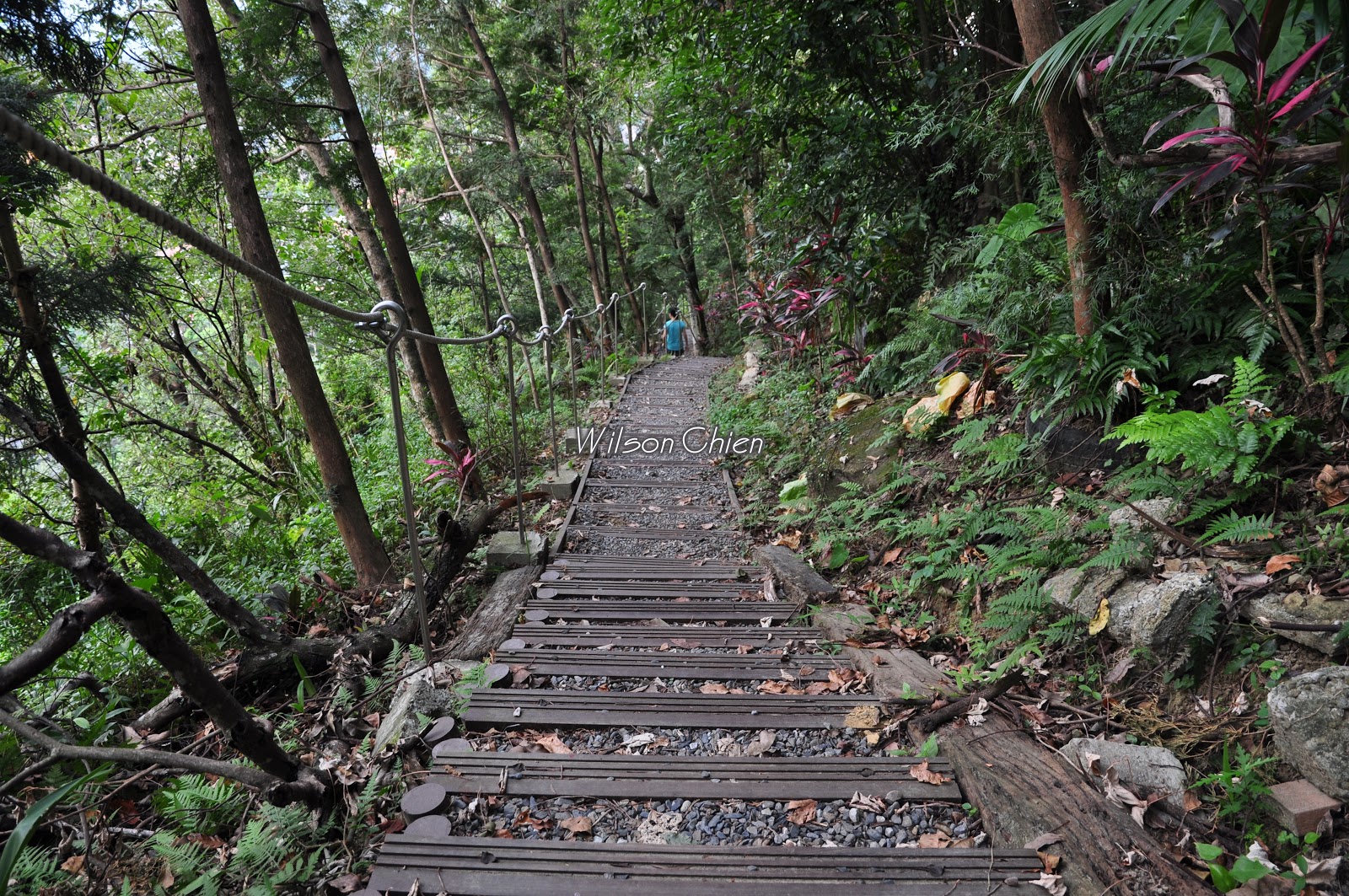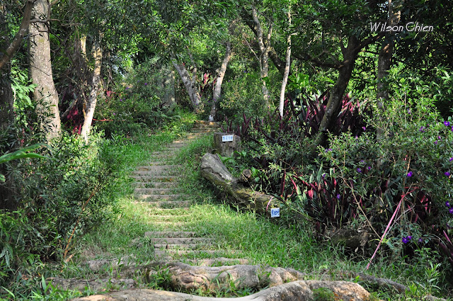 此處步道較人工化了 石階梯, 木棧道&碎石交錯的步道, 大樹林蔭鳥兒與松鼠穿梭期間,