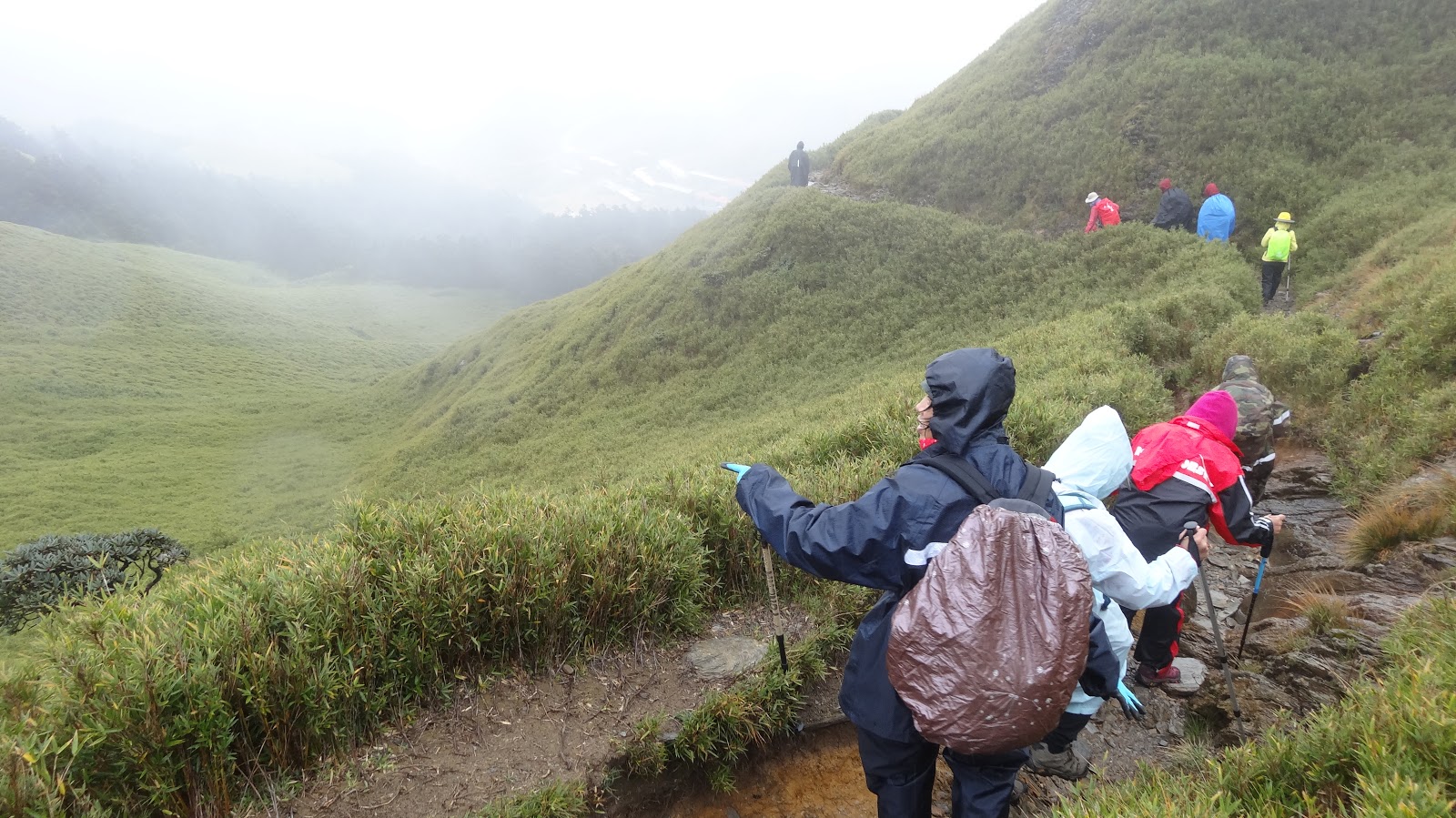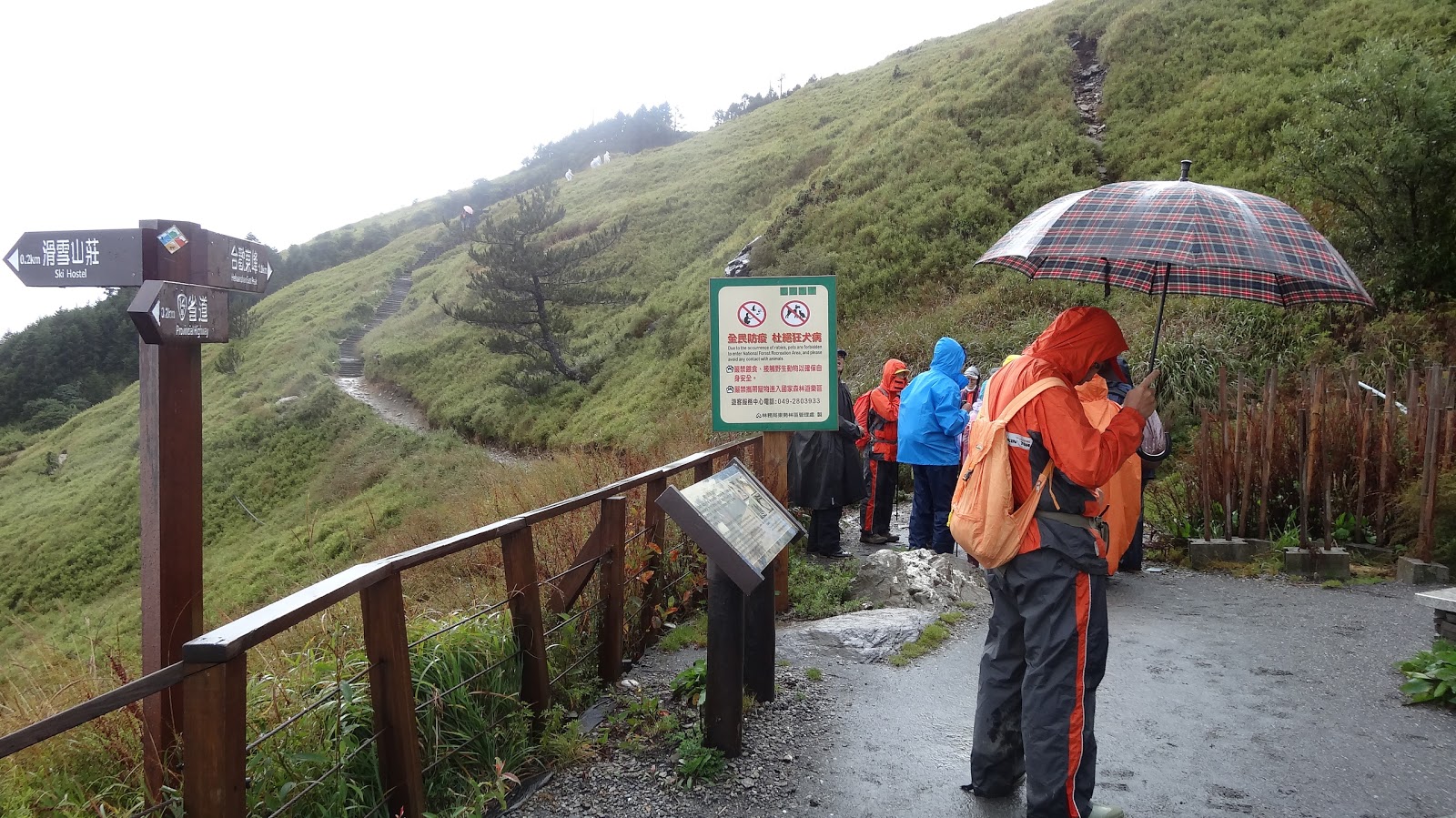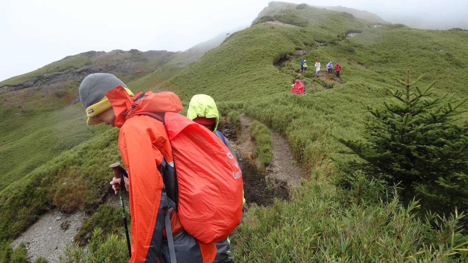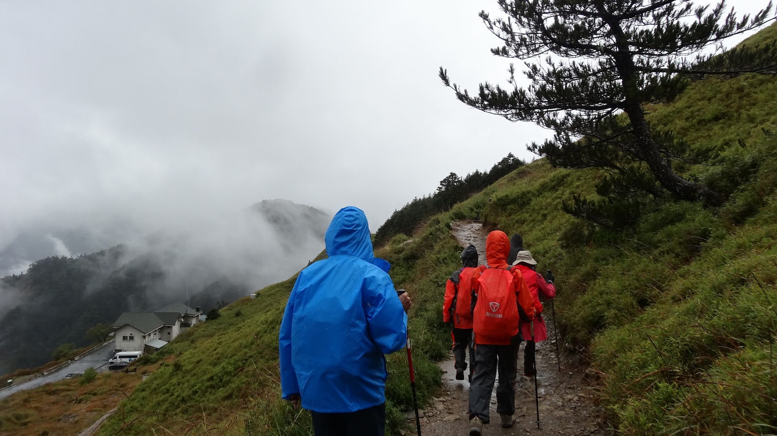 濕冷的天氣, 穿著雨衣, 雨褲及防水帽全副武裝把全身包得緊緊的, 首先挑戰的是合歡山主峰, 繞著山往上走, 雨不停的打在身上, 淋著雨刮著風每一步都覺得猶豫後悔, 或許昨天的表決該投反對票?