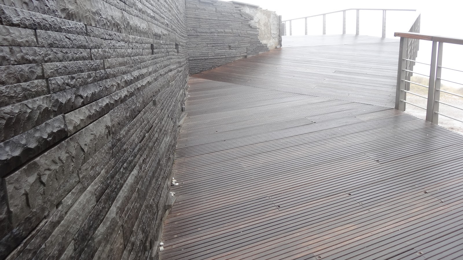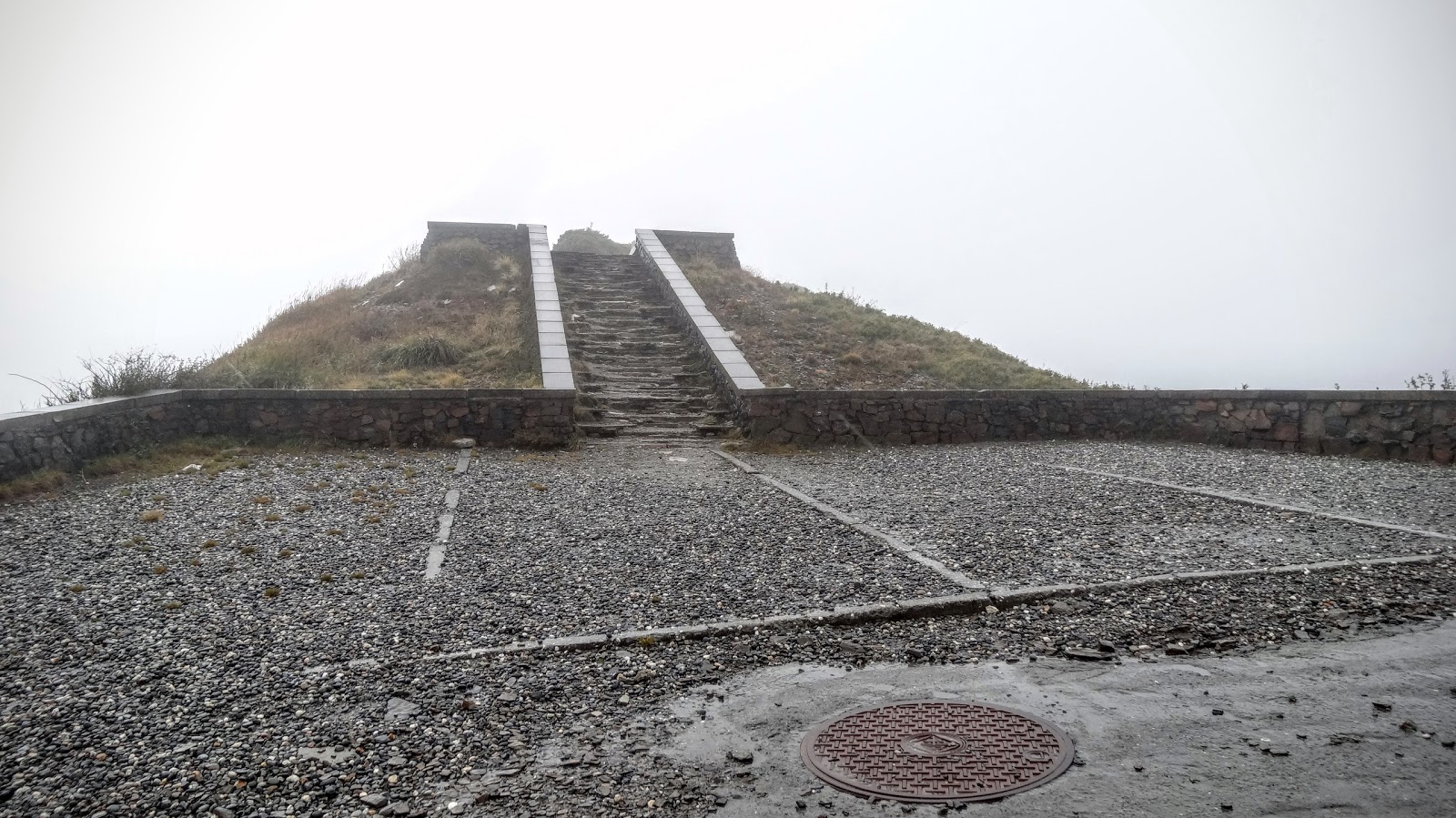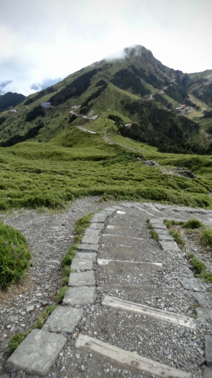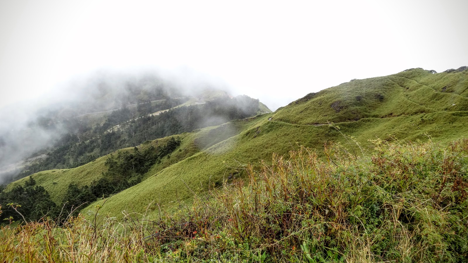 一眼望去無際的青青草原伴著山巒與霧霾有說不出的美麗與清新, 順著木造階梯往上走, 木造階梯雖濕不滑, 但強風一陣一陣颳著深怕被吹走, 雙腿微微發抖越走越慢越無膽, 眼前的階梯看似無止境