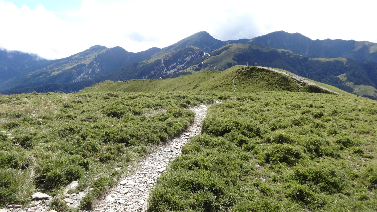 繼續挑戰說是最容易走的百岳石門山, 右後方高聳的山是預定明天要爬的合歡尖山, 看那陡峭的階梯實在不是我的菜, 不管了, 先把石門山撿了再說, 順著公路旁的稜線走