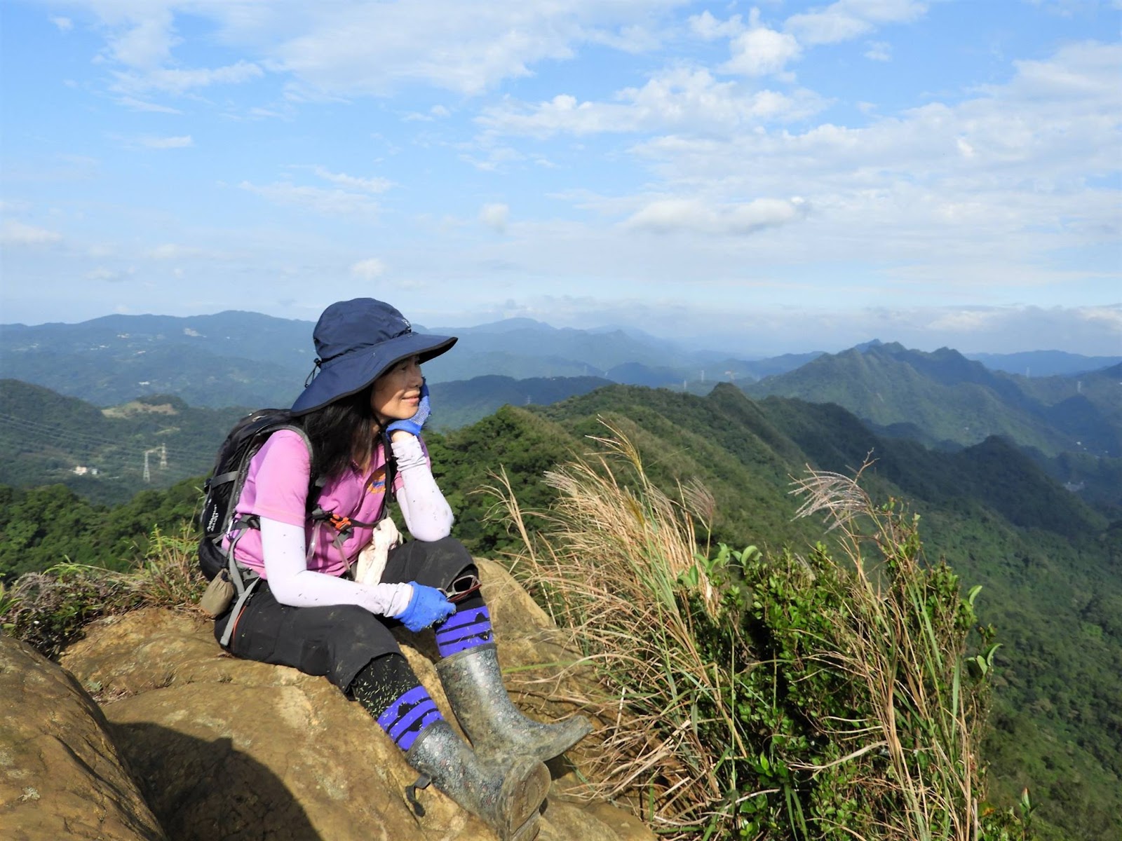 好奇怎會有兩個山頭呢? google一下: 原來筆架山位於新北市深坑區與石碇區的交界處, 是鋸齒狀的連峰岩壁, 最高峰是並立的兩座山頭, 遠看就像是插著筆的筆架, 因而稱為筆架山, 沒從遠處看所以只能靠想像了, 三人在此請山友幫忙合照, 留下美麗的見證, 耶, 我們成功上筆架山了, 真開心