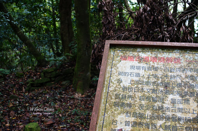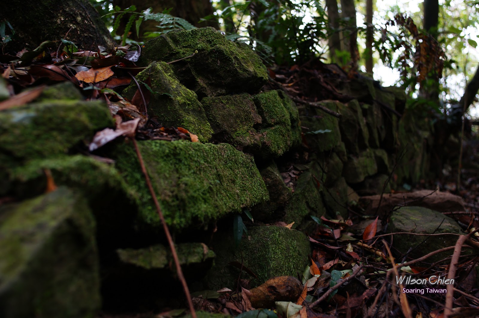 山徑旁一日據時期警備所還遺留堆砌的石牆遺址, 龍山部落長者稱此處先前還設有砲台