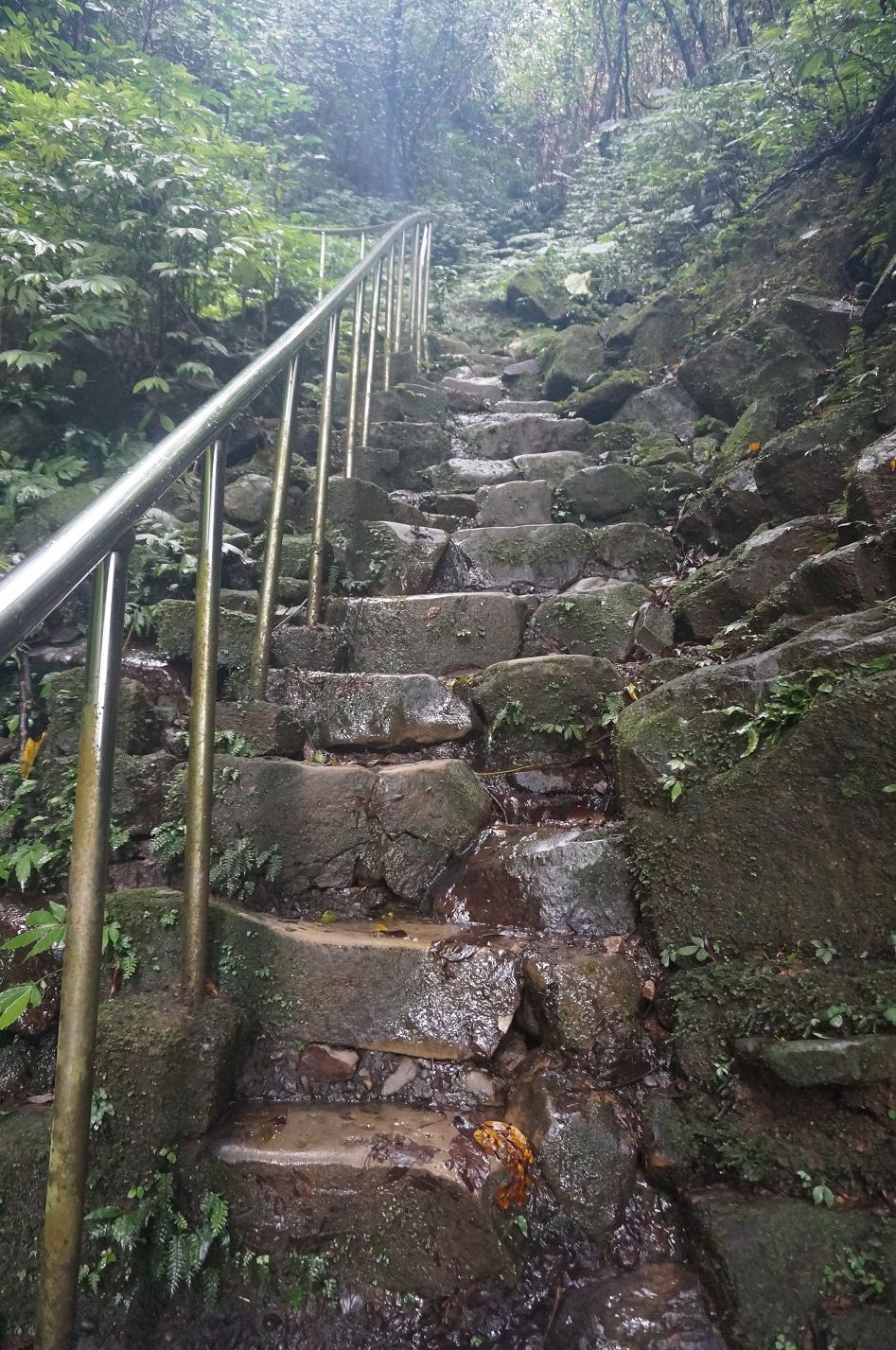 心得:銀河洞登山口到銀河洞瀑布處是連續的爬坡.但是因為走在河道邊.除了清爽還充滿芬多精.沿路也都長滿蕨類.慢慢走的話一下就到瀑布口.中途還有一處可以親近水邊的河床.來摸一摸清涼的水.暑氣全消.站在旁邊感覺都充飽電了.到銀河洞瀑布處.就特別適合拍照.隨便拍也拍了一大堆.除了壯觀的瀑布自高處傾瀉而下.卻也不太會被水噴到.設計的平台真是拍照的好地方.步道上方有座寺廟可以上去看一下.平台的右邊就可以續走步道.不過上去後有一段較為濕滑.甚至水就是在步道上流瀉.小心慢慢走通過.