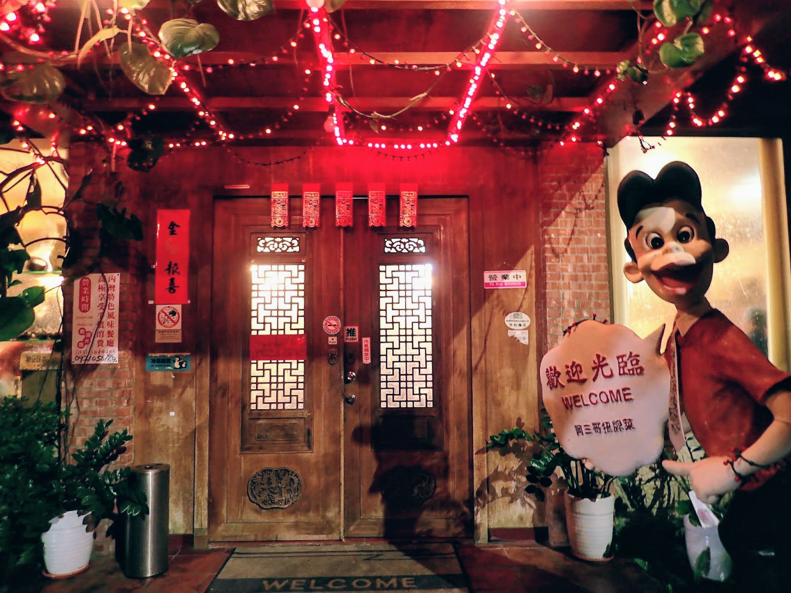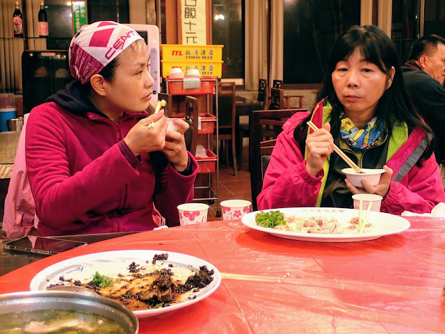 5:50來到阿三哥餐廳用餐, 客家菜脆皮油雞, 薑絲大腸, 梅干扣肉, 嫩豆腐, 蒸魚, 炸溪蝦...道道上菜就吃光光, 小李哥還每桌問問有誰要喝啤酒自己拿, 呵呵, 都快冷死了還是喝杯熱茶最實在