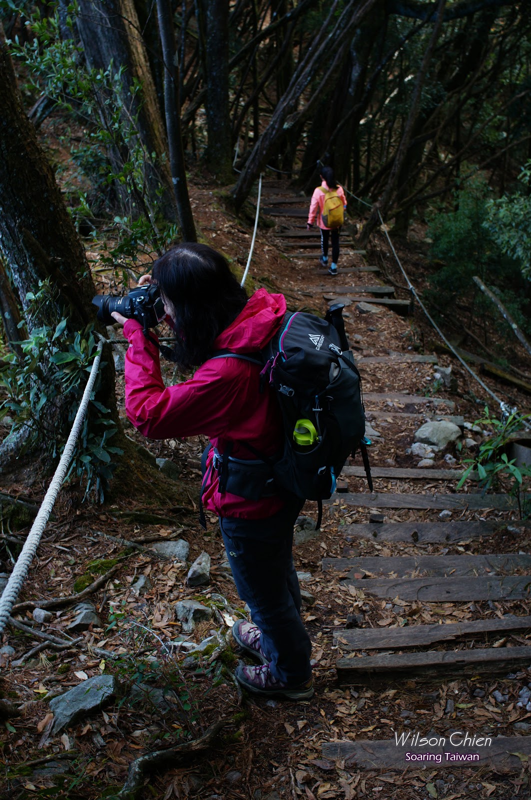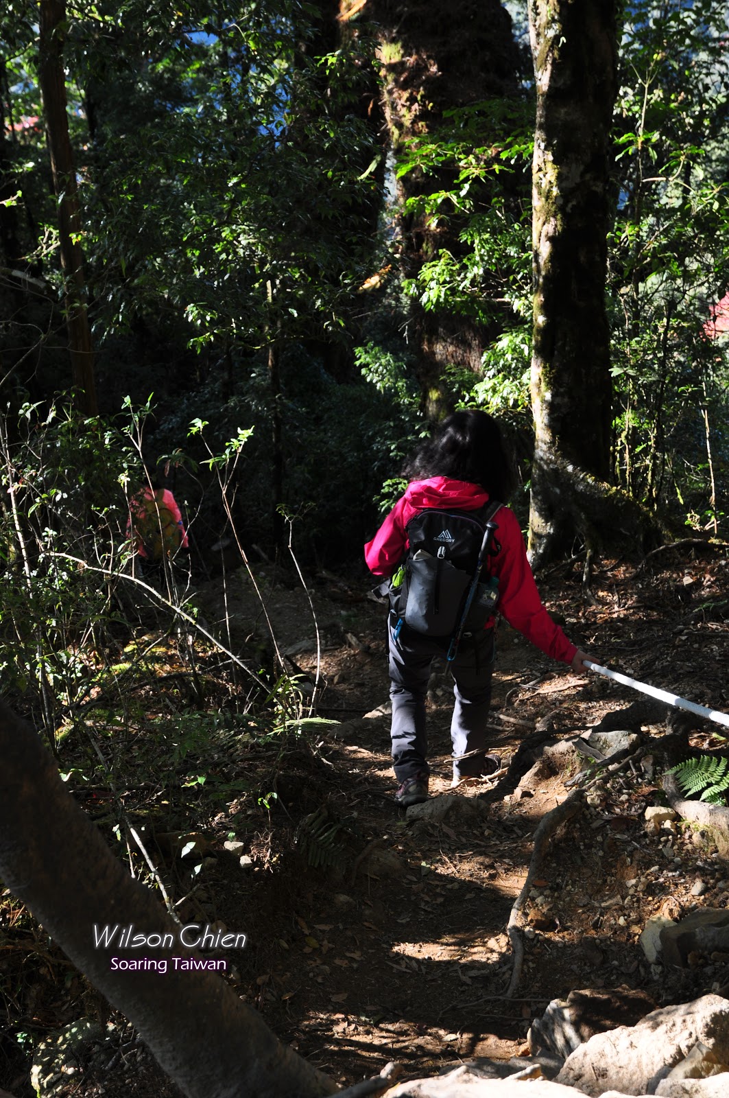 突然下降的山徑變成站立在前方的路, 這上爬路使老婆嘟囔著 " 阿你不是說都是向下的路嗎?"