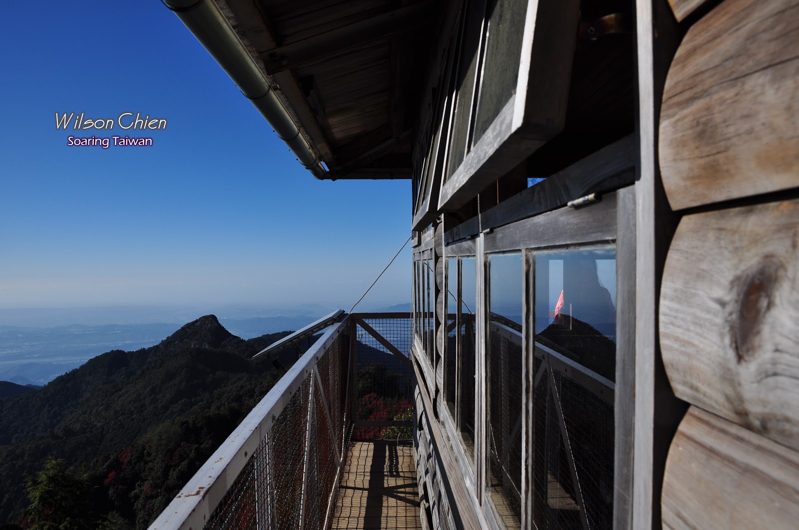 在塔上觀望著來時路而鳶嘴山的山型與特徵很貼切, 那紅色一片就是剛剛的楓紅搖滾區