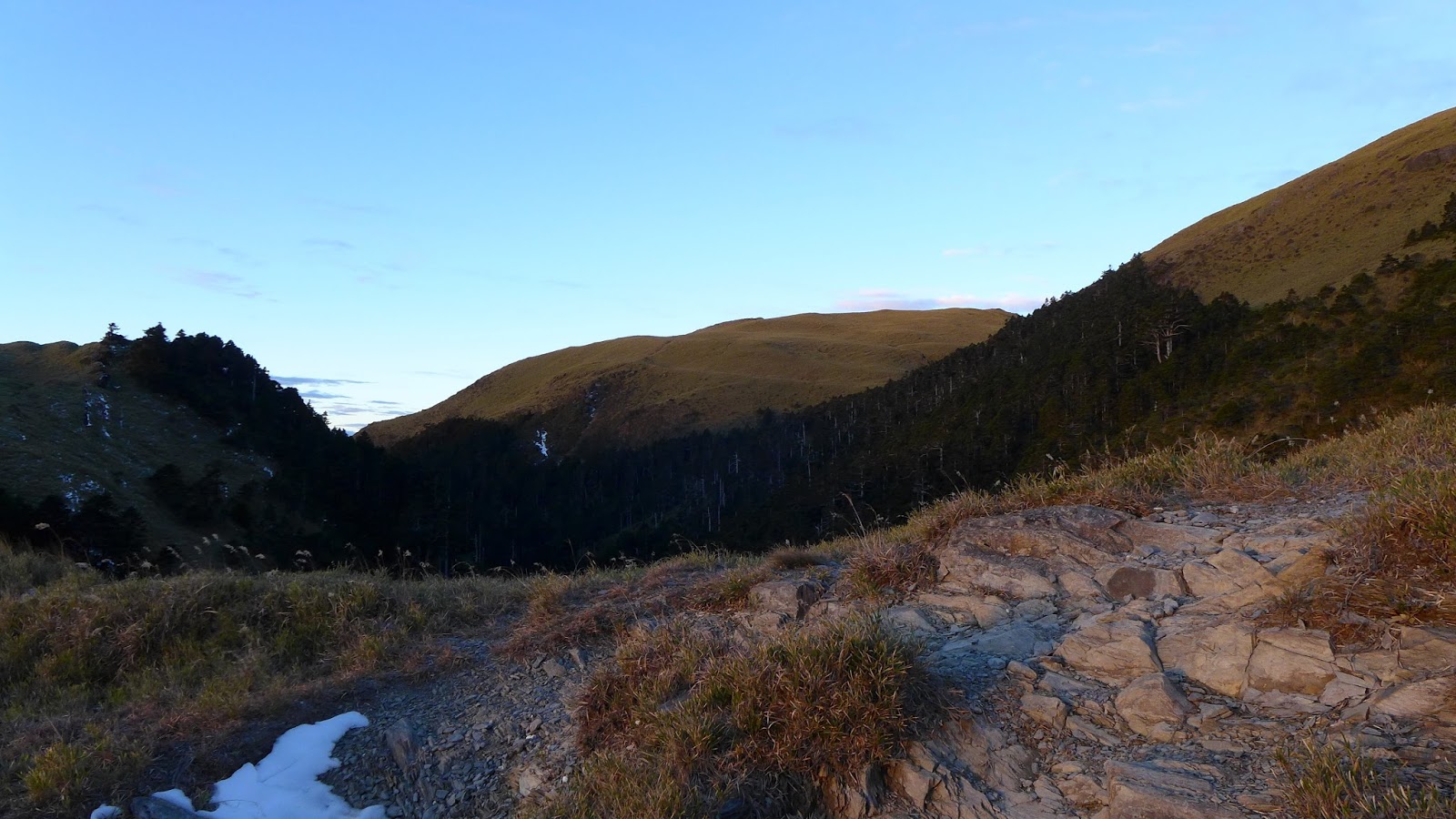 第2天我們5點出發,沒計劃看日出,加上前一天走到天池丫詮、凱雲已經有點累到,多休息點讓體能恢復一下,先往奇萊南峰,到天池開始地上雖有結冰,但還不需要穿冰爪就能通過。