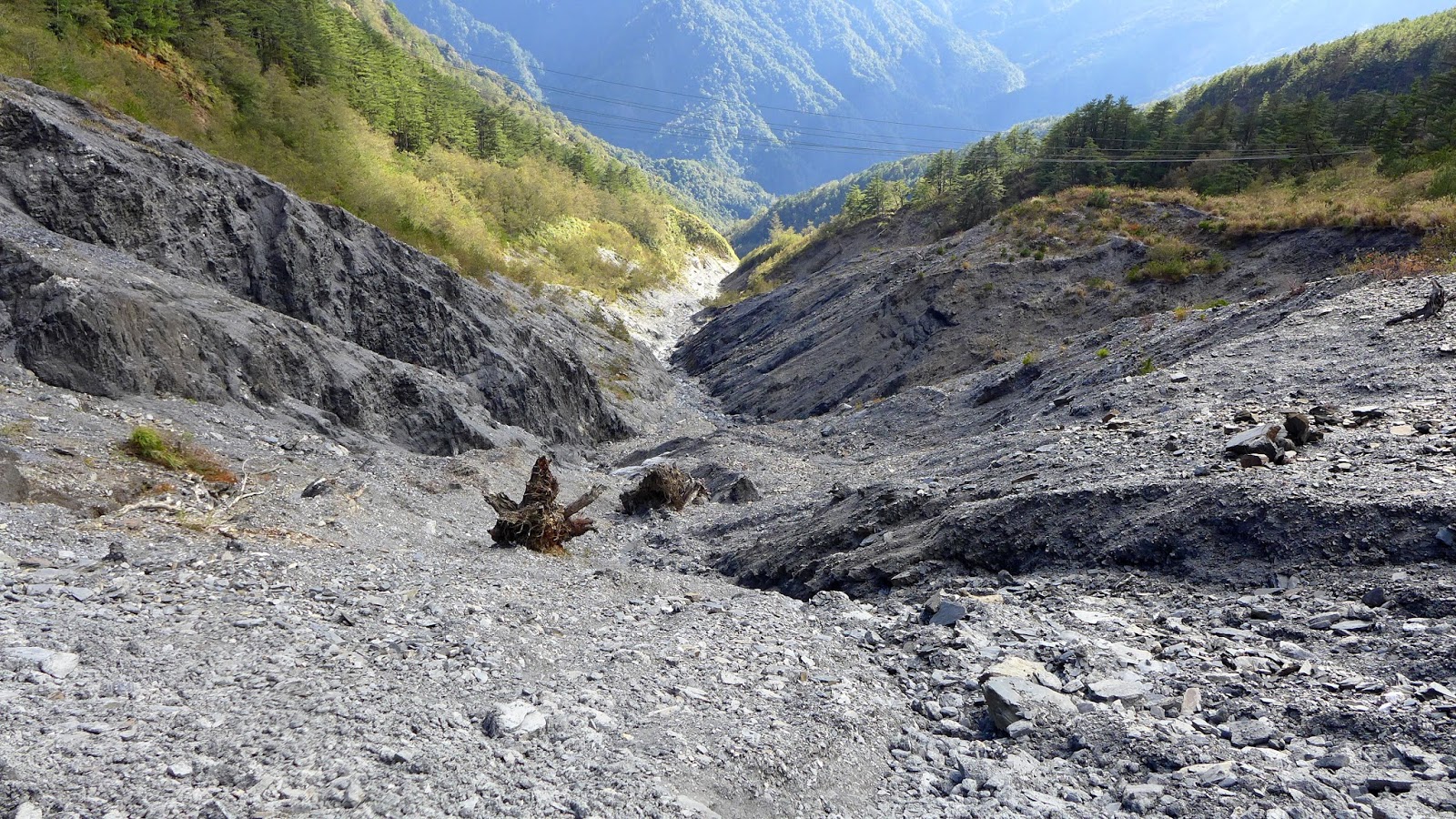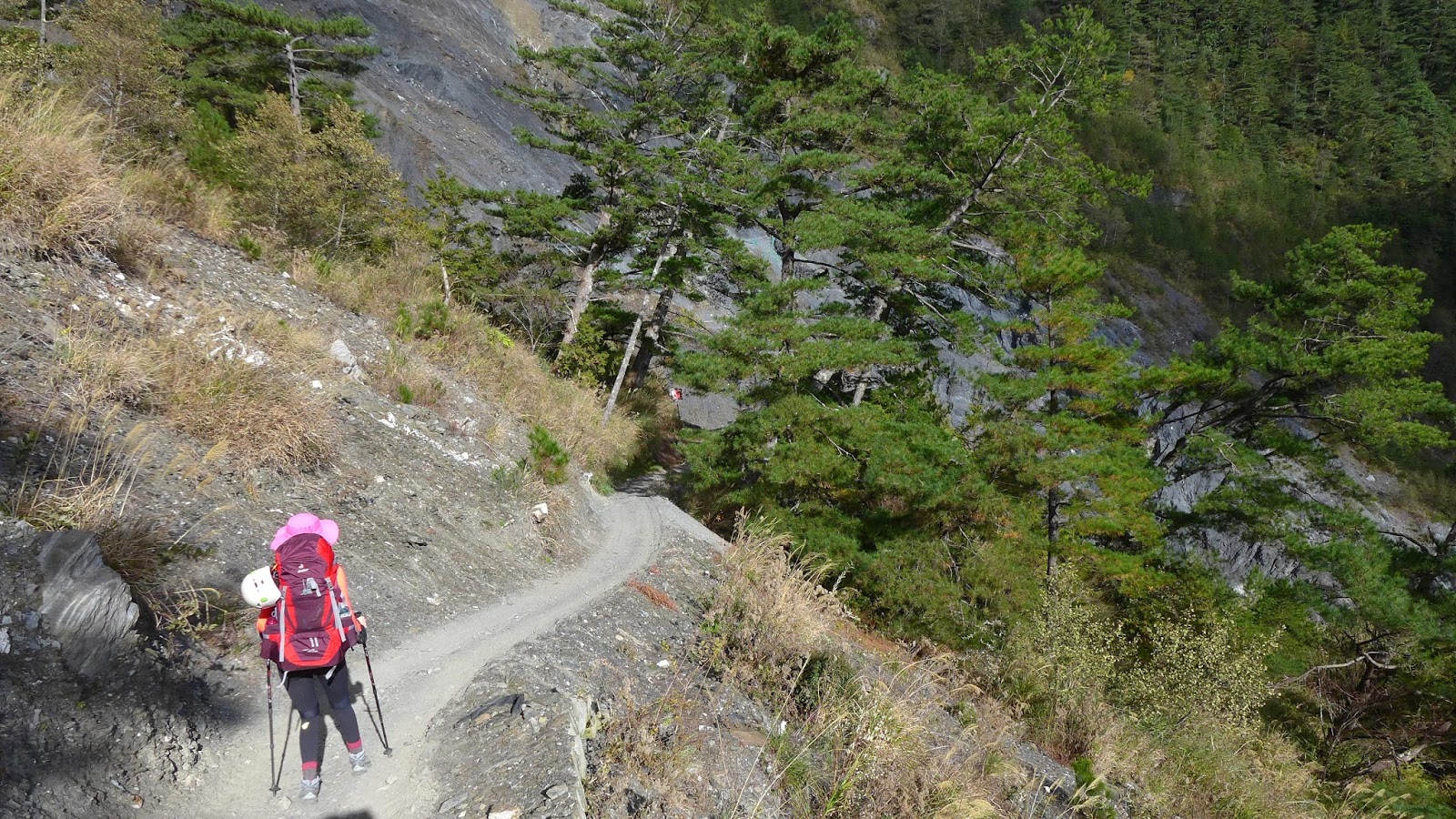 這一小段凱雲剛走過去沒多久就聽到有石頭在滾的聲音,沒一會噴下幾顆棒球大小的石頭,叫凱雲趕快加速,我們後面等一下確定沒在掉落石頭後趕緊快步通過。