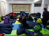 在洛韶山莊,天已不再下雪,但冰冷的寒風依舊侵肌透骨。山莊中可享受沐浴熱水的快感,但在著衣過程中,四周的寒氣仍致使雙唇不覺自顫。夜晚山莊貼心的為夥伴們準備二個睡袋抵禦低溫,使得周遭雖冷,但夥伴心中卻感溫暖。十人一室,二件睡袋,大夥一同陪伴入睡。擾人的地牛,仍然熱情的翻身及打擾。不定時的震動,使得夜間仍然無法安然入眠。