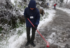 雪紛飛,路上積滿了雪。穿上登山防水靴,手持塑膠刷,享受著在雪地鏟出一條沒有雪的步道的初體驗。鏟雪過程是累人的,但心中卻是歡愉的。這也許是健行精神,讓夥伴革命情感的發酵,真心服務,成為心中最大的感動。