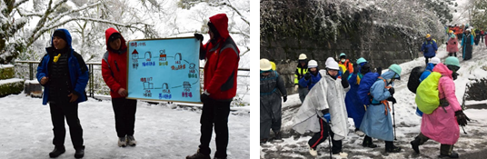 第二天早晨,受到寒流的影響,氣溫持續下探。室外溫度計顯示著攝氏4度,加上一夜水氣充足,山莊外路邊已累積了殘雪。而山莊內備妥的熱騰騰早餐,成為早晨最期待及最感幸福的時刻。整裝出發前,觀雲駐站大哥大姐們,仍然不忘熱情及搞笑本能,以行動劇加深夥伴面對落石時的處置,生動活潑搭配恢諧內容,令人印象深刻。就在駐站大哥大姐的祝福、打氣及歌聲中,夥伴們背包上肩,穿上雨衣,於「觀雲萬歲」的口號中,出發迎向今天觀雲到慈恩16公里的行程。