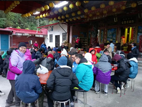 第四天清晨,洛韶地區的裊裊炊煙的景色,讓早起有了特別的回饋。昨晚數度被地震嚇醒的情緒,早已在如畫的景色中盡數驅離。年輕的駐站大姐以「腿之歌」輕快活潑的音調,搭配可愛舞蹈喚醒夥伴們的精神。天氣報導顯示今日氣候轉為乾冷,這無非是這一天最好的消息。收起雨衣,打起精神,就可以盡情的將沿途美景盡收眼底。慈安宮享用熱呼呼的早餐,外加瑤池金母法力無邊庇佑下,今日,將會是順利的一天。