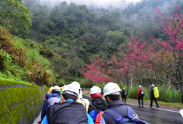 過了管制哨,迎來的是路旁的粉紅櫻花,大方的向夥伴們一路招手。路過的汽車駕駛及機車騎士們,也不約而同的向大夥豎起大姆指,讚嘆著大家的勇氣與毅力。接近午餐時刻,想享受美味,就得先付出。這個體驗在今日的午餐充份的體現。想在西寶這個美景如畫的小學校園裏享用午餐,就得征服讓人視而膽怯的長上坡。或許是物質的引誘吧,也有聽見零星的哀號聲,但不管是腳痛的,酸的,背包沈重的,全數上坡抵達西寶國小。午餐是美味而特別難忘的。休息時間也是所有行程中最長的一次,讓大家飽覽西寶國小所帶來美景。