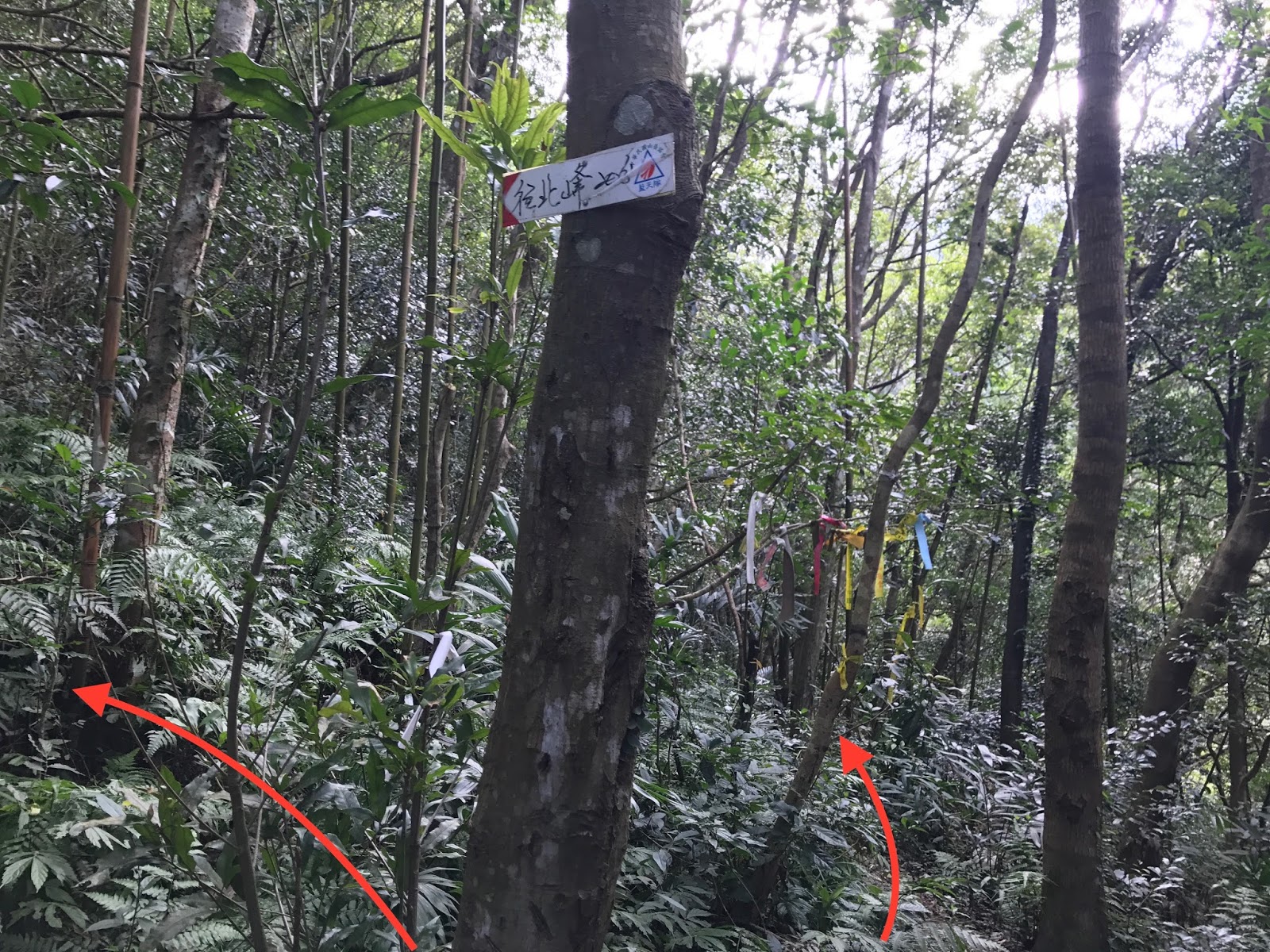 [上圖] 第二天出發後十個小時,我們終於走到北插天山路線上的三岔路,分別往北插天山、北插天山小烏來登山口(木屋遺址)、和南插天山,樹上釘有路標(見下圖)。