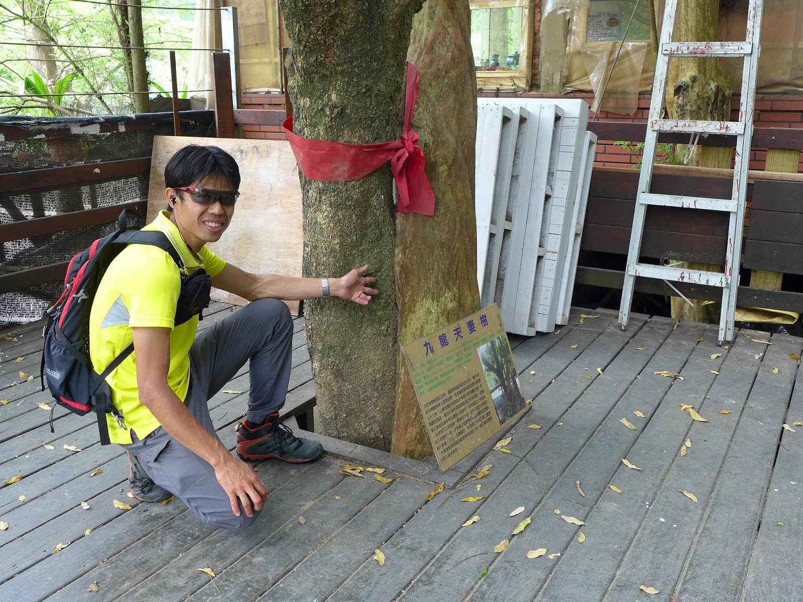 這九龍夫妻樹名字很有氣勢,但實際小巧可愛,當下第一時間還沒找到,找到忍不住笑了一下,原來是我自己把它給想大株了,這對夫妻樹是一顆百年九芎及龍眼樹,旁邊的解說牌敘述著這對夫妻的過去,40年前這顆龍眼樹還只是小樹枝,沒想到長大底部樹根與九芎交纏在一起,十分特別,老少配的一對。