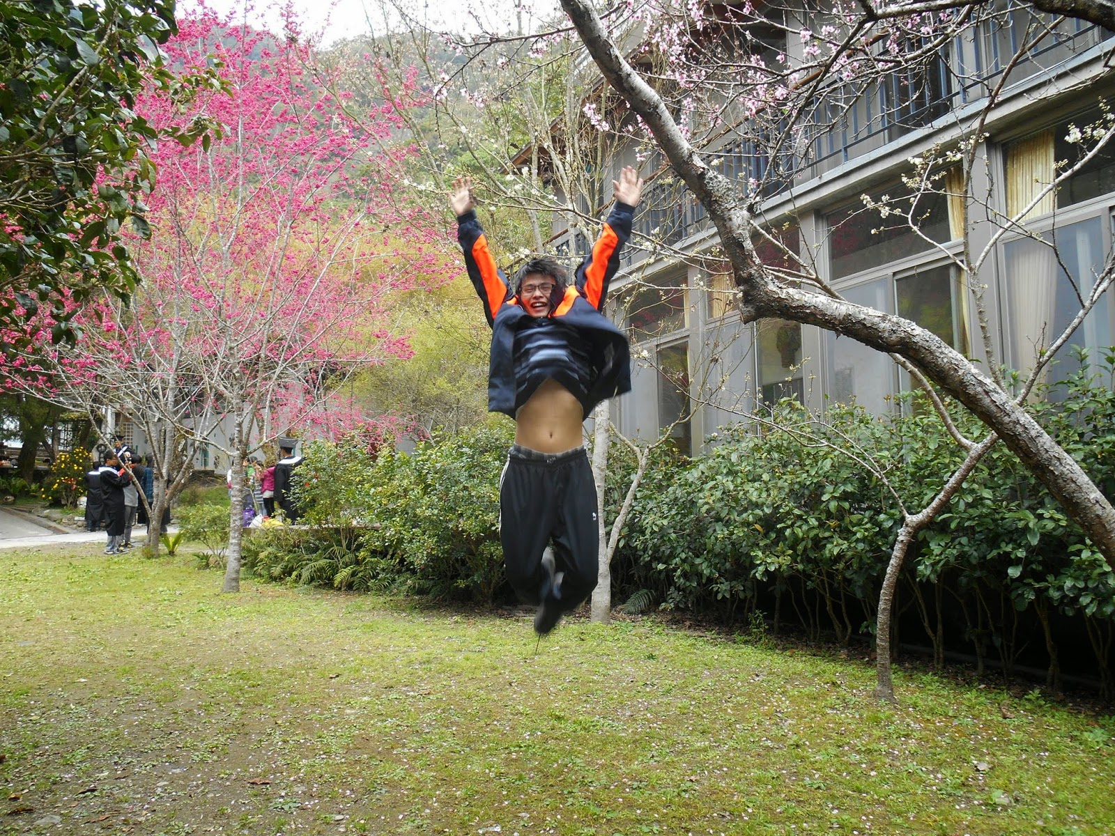 吃完早餐,準備出發囉!!! 一旁的日本櫻花開得正漂亮~ |