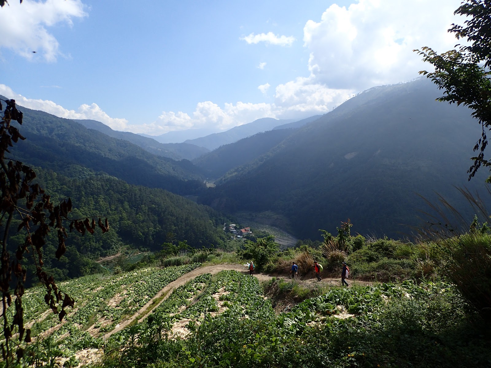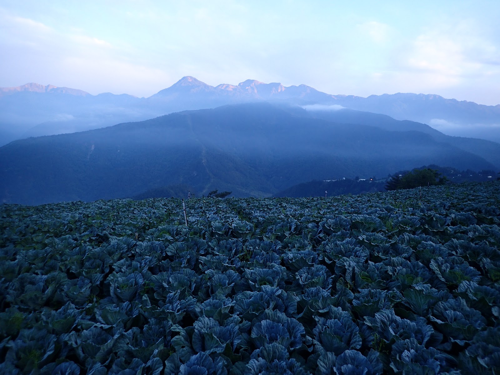 順著產道走, 經過非常壯觀的高麗菜園, 遠眺雪山山脈, 群峰疊起, 山嵐渺渺, 見此美景, 睡眼惺忪的雙眼終於張開了
