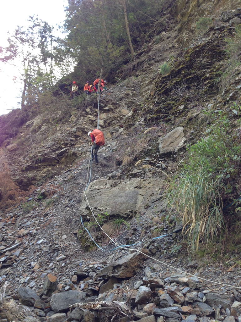 | 此段西稜最危險的一處,其實只要小心走,沒有問題的,但預防現場的繩索老舊,隊伍還是準備一下自己的繩索會比較保險 |