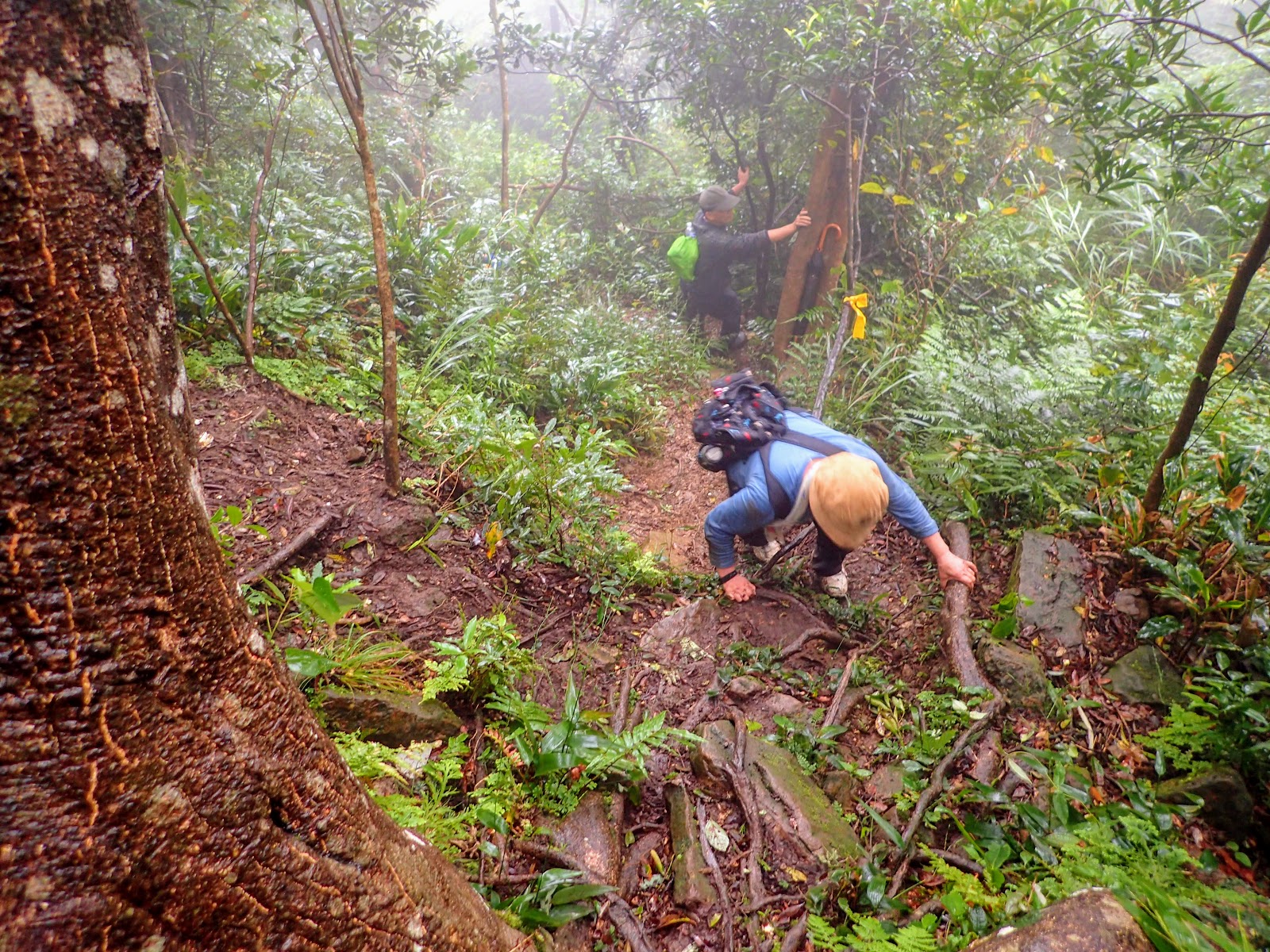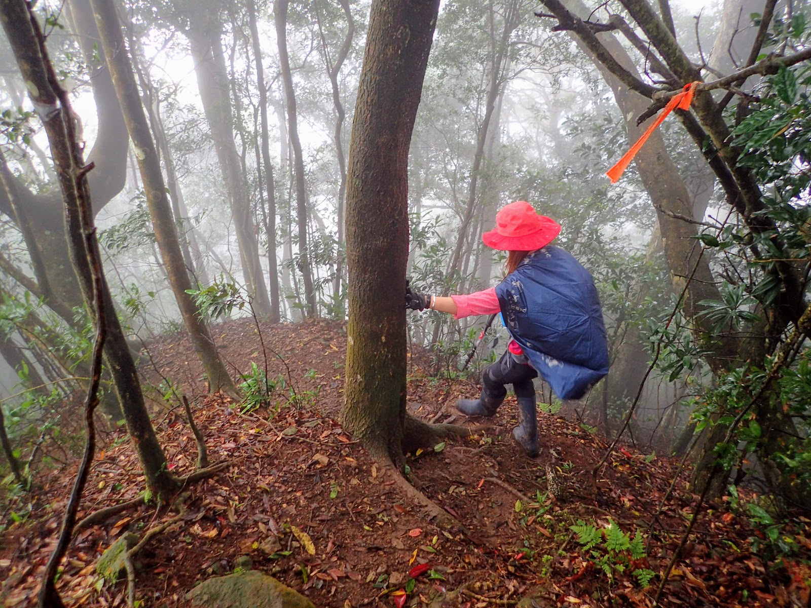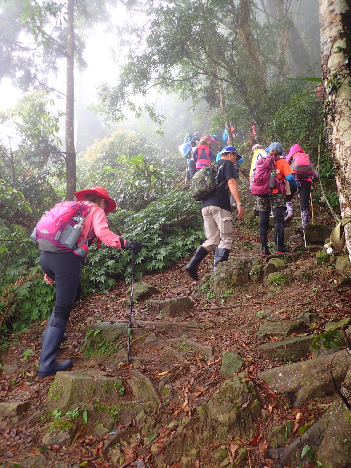 走在前頭的ㄚ姐說她都沒爬過山, 撐著雨傘穿著一般球鞋跟著翻山越嶺