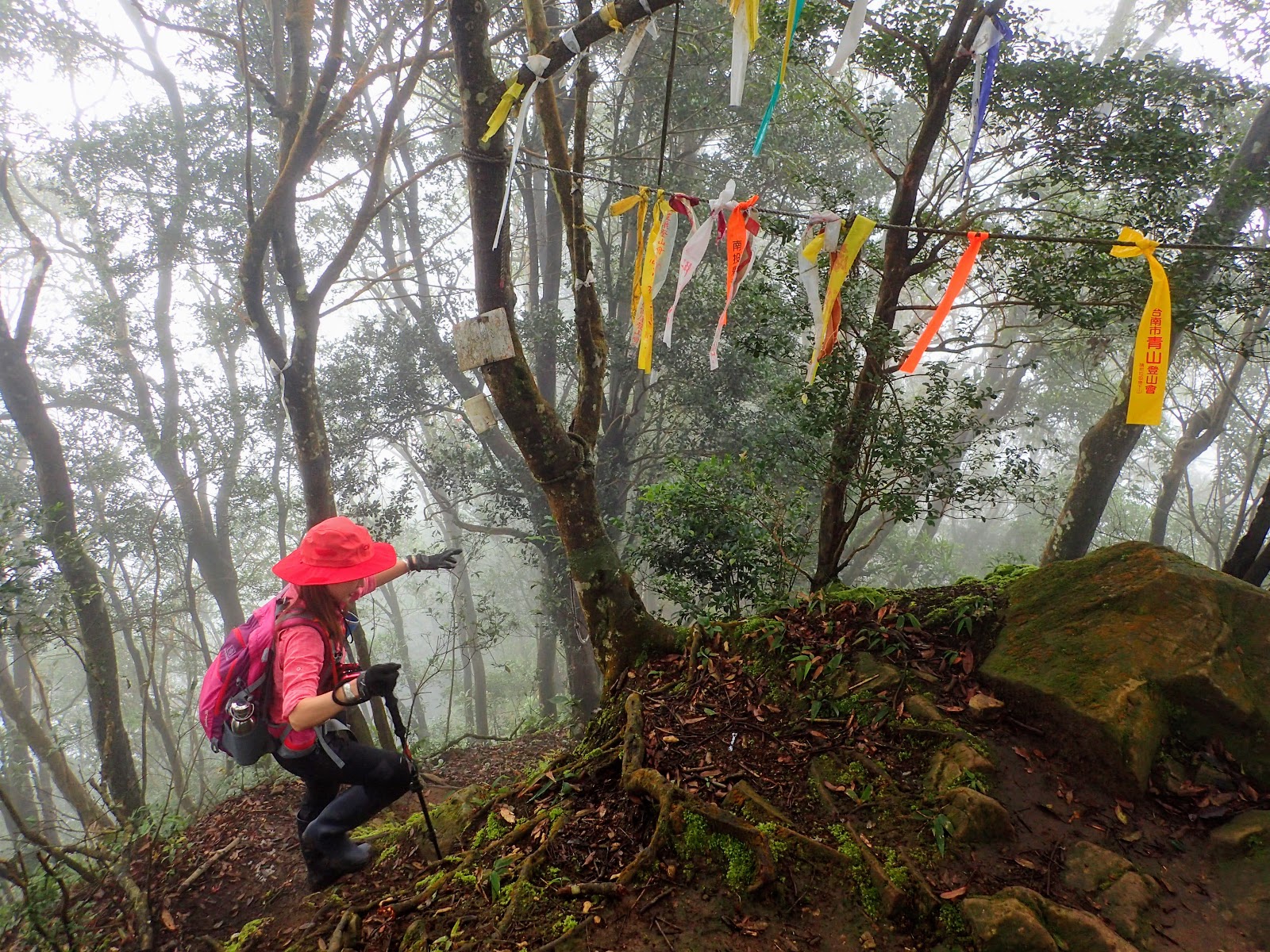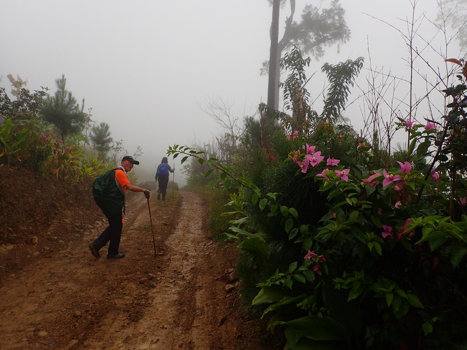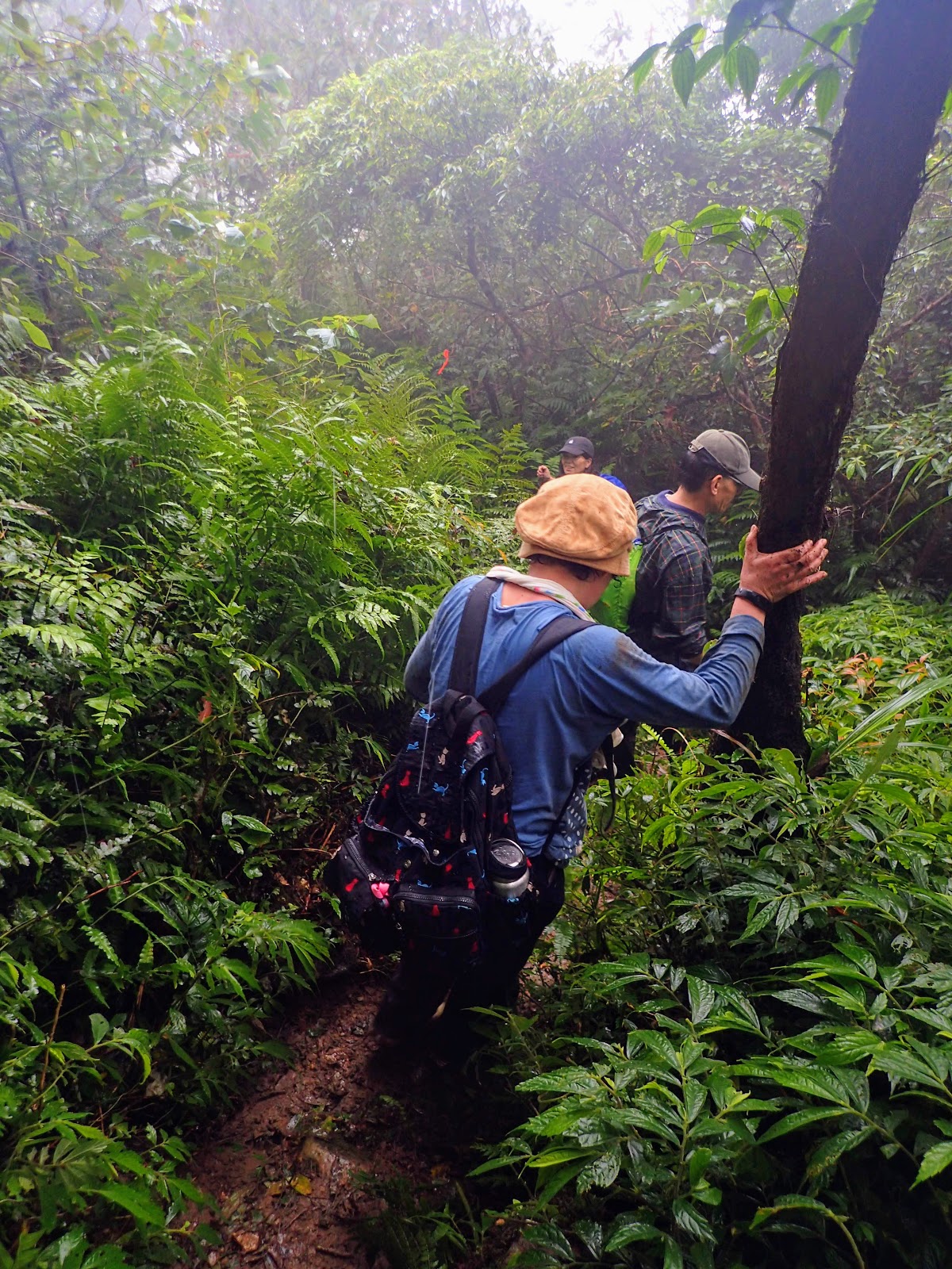 走在前頭的ㄚ姐說她都沒爬過山, 撐著雨傘穿著一般球鞋跟著翻山越嶺