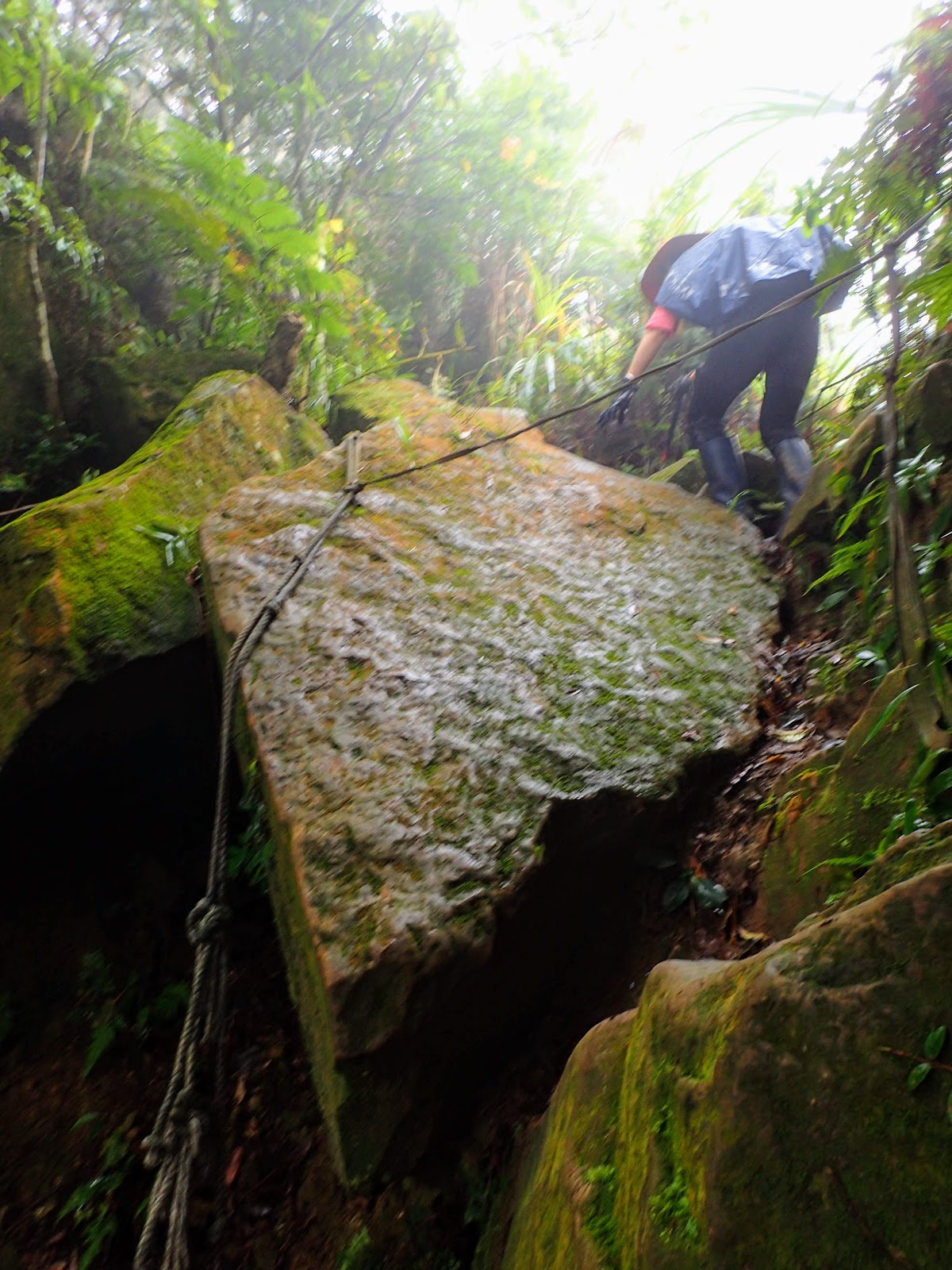 拉著繩索攀上佈滿青苔的岩石