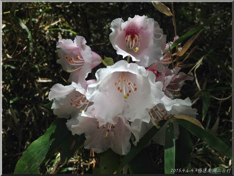 路上時不時開著漂亮的杜鵑,不過此時雲霧已起,天氣轉差,更慘的是我們在通過五岩峰時開始下起豆般大的雨,大家手忙腳亂的穿起雨衣褲,在這種情況下,有人體力不支、又正在通過此行最困難的路線、又剛好下起大雨,這是上天派給我們的考驗吧?