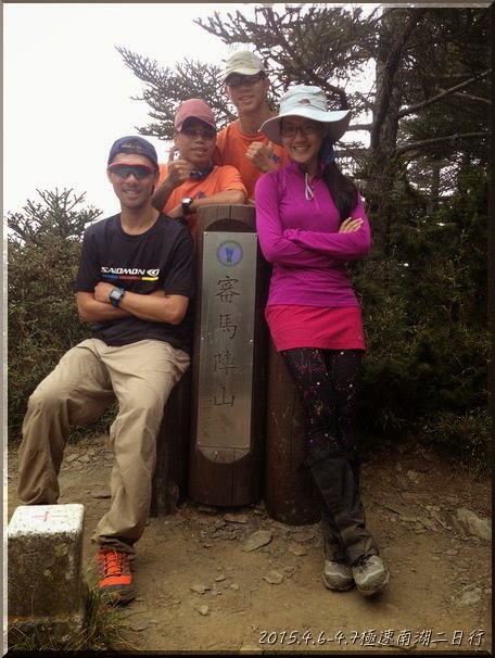 過雲稜後依然是一陣陡上,而且是要爬石頭爬樹根的陡上,此時開始有人體力下滑了,但依然還保持在比表訂時間快的速度上,出森林後路邊就是審馬陣山登山口,在登山口處簡單用餐後前往攻頂審馬陣山,平平緩緩的路走一兩分鐘就攻頂,