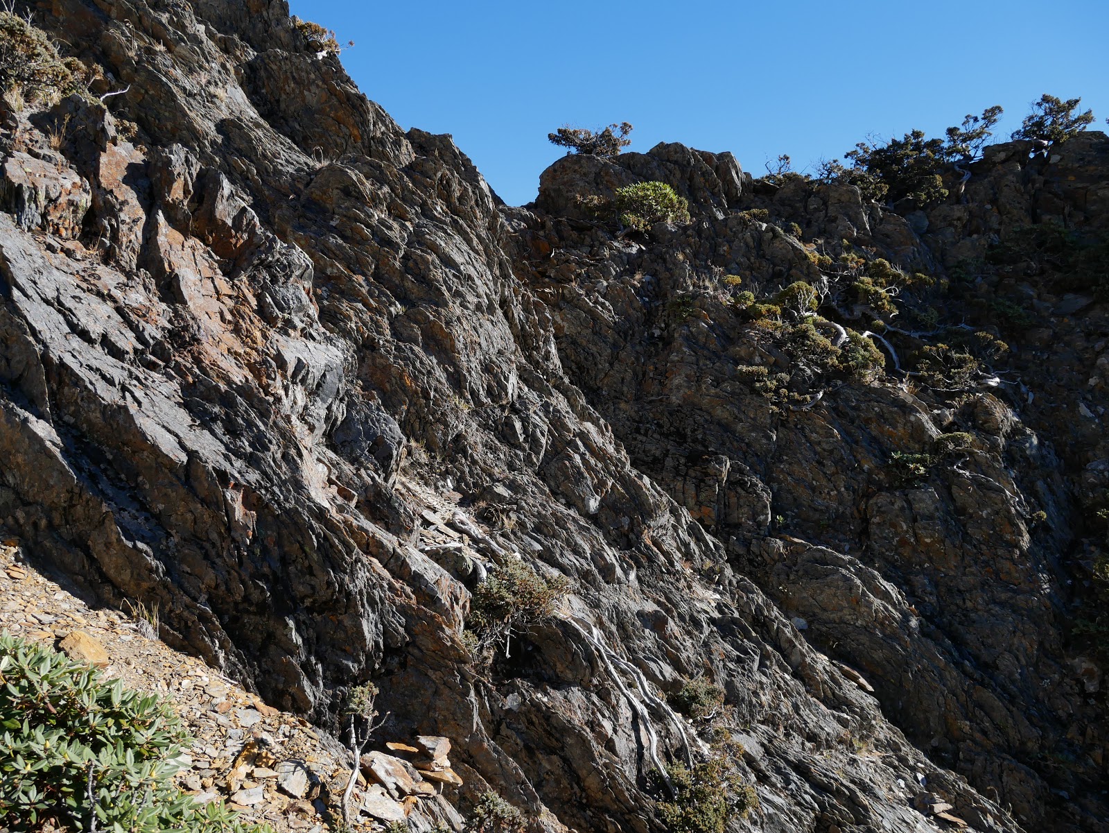從3667岩峰開始,就是一路下坡再下坡,嚴格來說,這個下坡並不算難走,不過可能因為昨夜的高山反應,再加上今天天氣真的太好整個大流汗,雖然背了2.5L我還是覺得不夠喝,曬到頭昏腦脹,腳步也越走越慢,從2.7K->1.2K這段我就花快兩小時,內心則是不斷質疑玉管處的里程牌是不是有誤差,看著剛才走下來的假山頭像一堵牆,我已經不敢想回程時會是怎樣的慘況。
