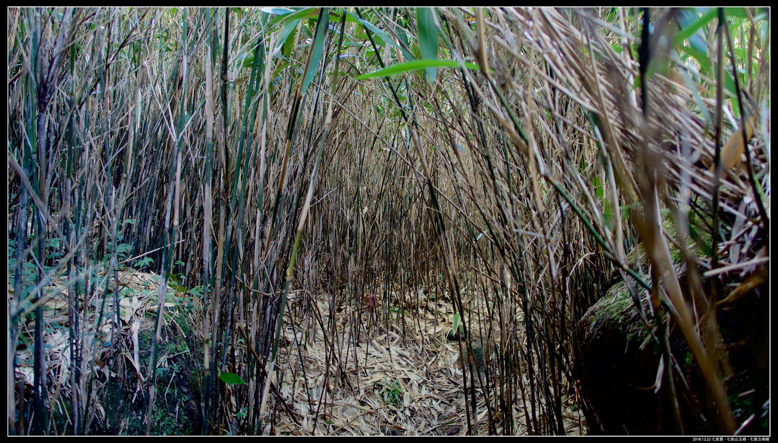 這張照片是走上【七星山主峰】觀景岩,往回看剛剛鑽過的箭竹林,從山神廟爬上來,就是從岩石下這片箭竹鑽出來。