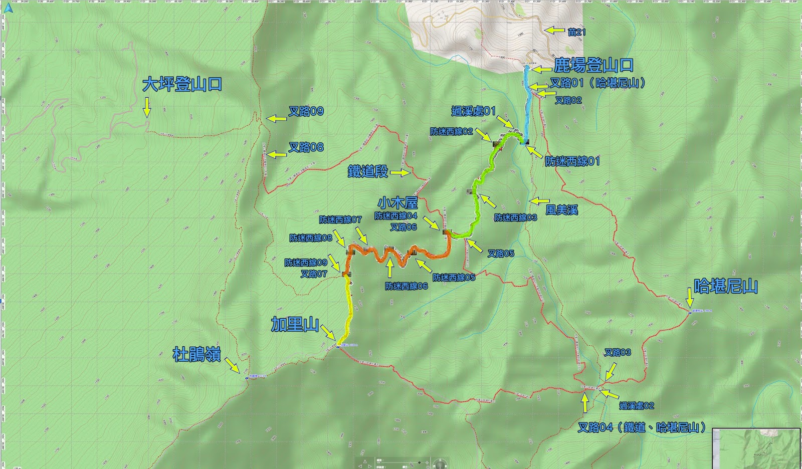 「鹿場登山口」-叉路01 -過「風美溪」01-小木屋(叉路06)-救援防迷西線標號9-【加里山】基點。