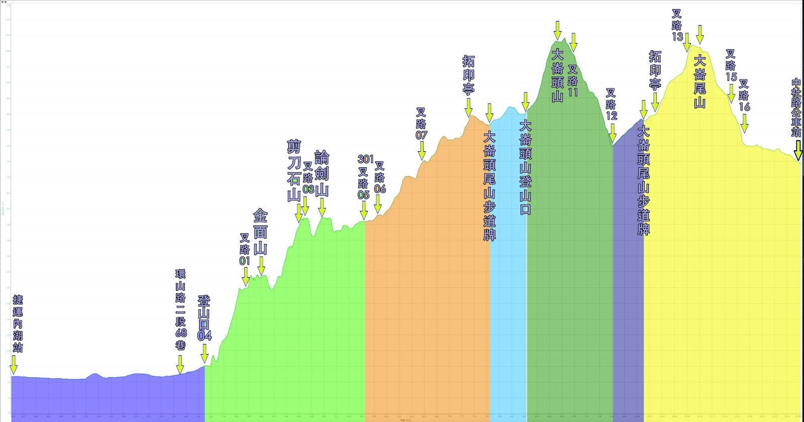 2018年【金面山】【剪刀石山】【論劍山】【大崙頭山】【大崙尾山】路線高度距離說明: