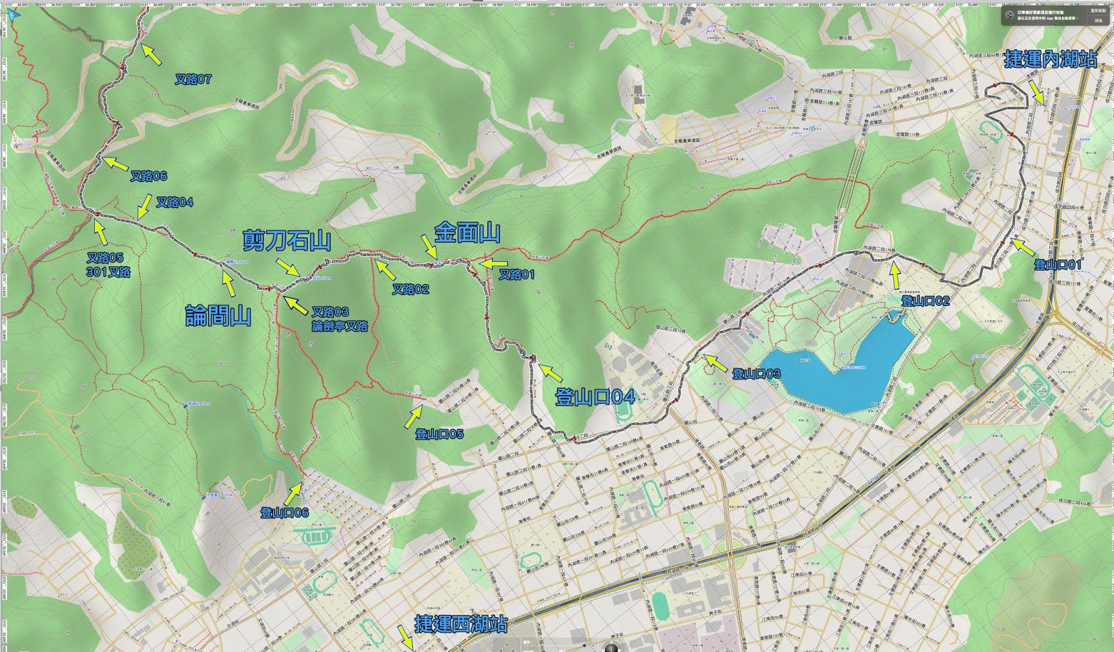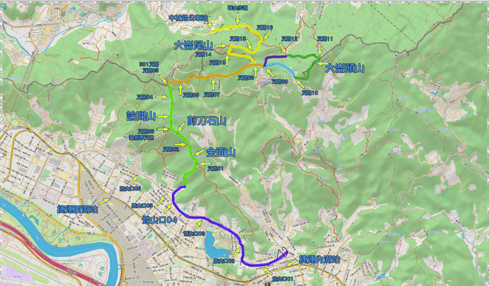 彩色路線則是2018年由「內湖站」走到登山口04進入【金面山】【剪刀石山】步道,經過【論劍山】轉到【大崙頭山】【大崙尾山】步道,最後由〖翠山步道〗到中社路底公車站搭乘公車到劍潭站。