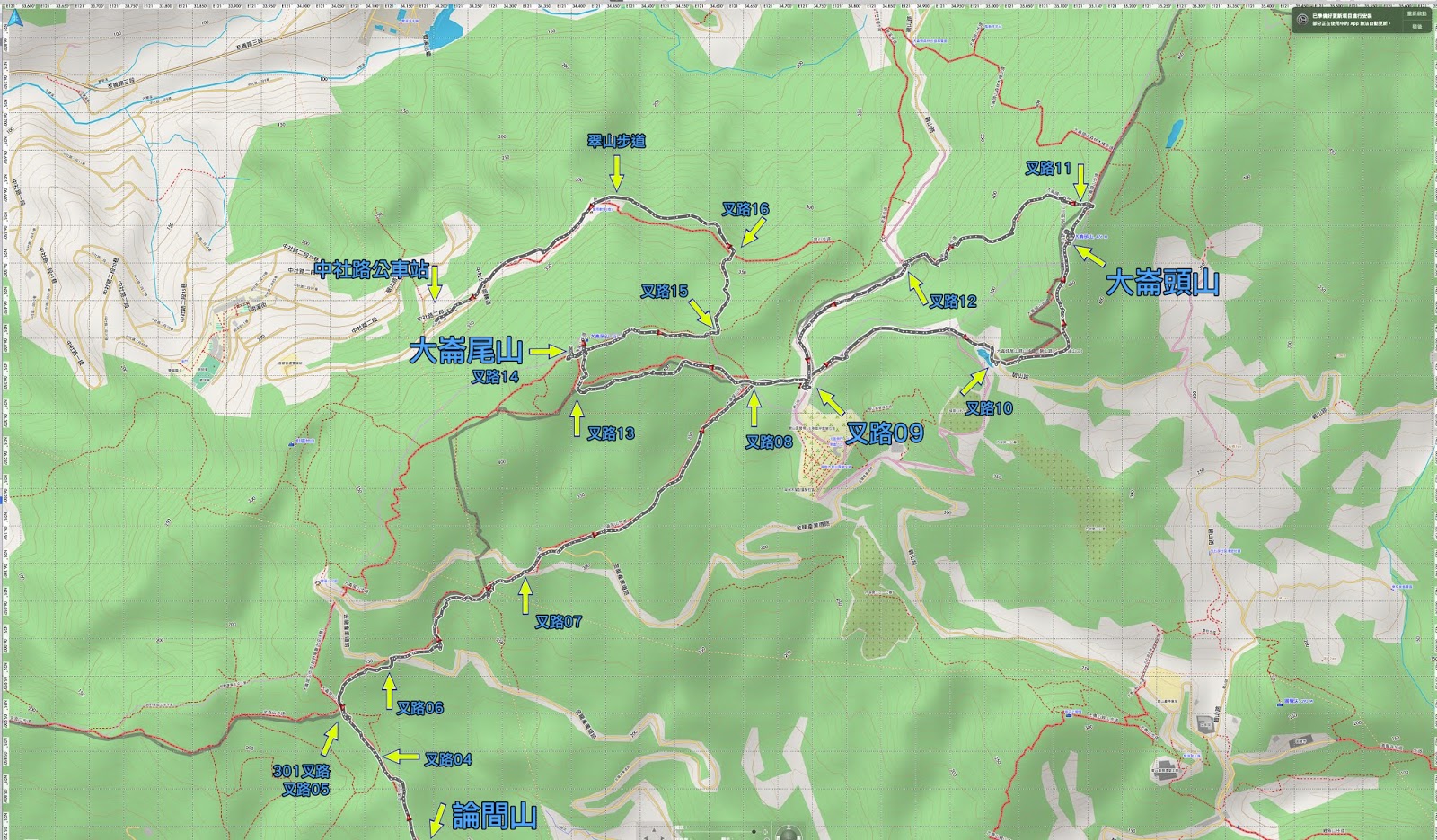2018年這次,從【剪刀石山】走到【大崙頭山】就是在下面這張照片的「301」(軌跡圖標示叉路05)轉走〖大崙尾山步道〗到「碧山露營區」,再從〖大崙頭山步道〗上【大崙頭山】,下山之後再從「碧山露營區」走回到【大崙尾山】。