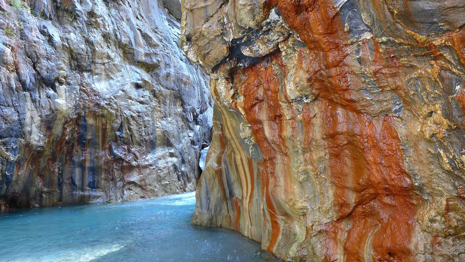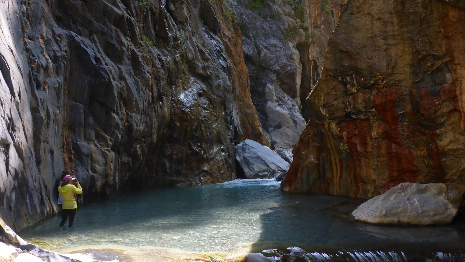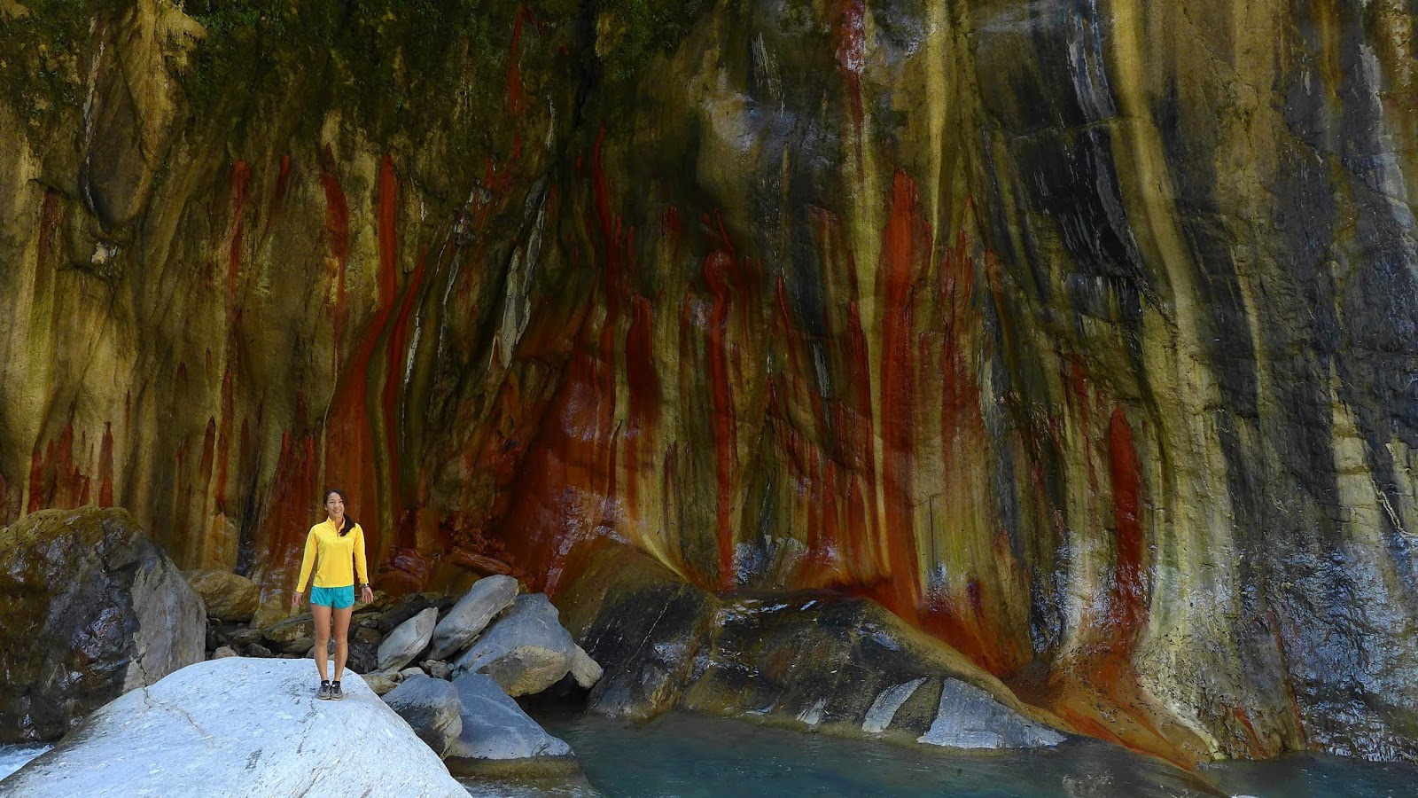 還沒到大家在拍的那片彩壁,進峽谷沿途已經有不少溫泉沖刷形成的彩壁,都是相當不錯的景色,從瀑布到大彩壁約2K。