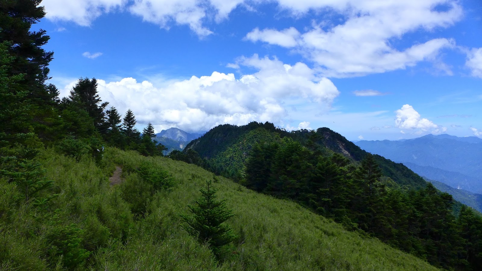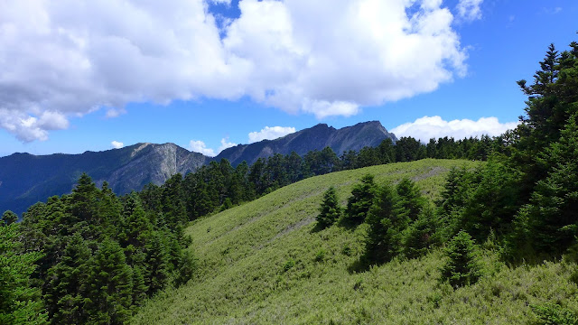 稍微往前去看一下,穿過箭竹後是一片視野不差的草原,回三叉路背包丟著下去找隊友看是否需要幫忙,得知春雄因腳不適提前下撤回營地,找到這裡最後的夥伴後協助爬上這段陡坡,三叉路這大休。