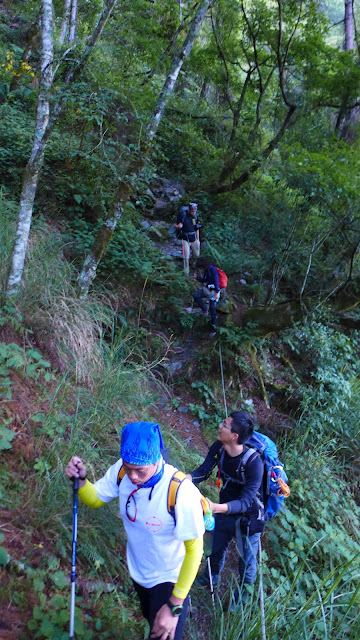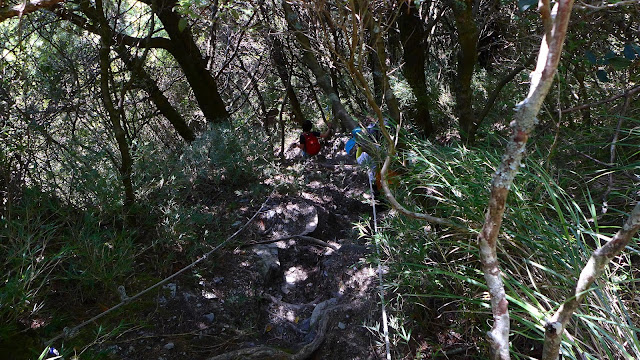 過水源後,馬上就開始讓我有複習畢祿、羊頭的感覺,抓個分野的話,到一處拉繩垂直大岩壁前,陡上過程中有緩和地型這點像羊頭,岩壁之後到稜線三叉路根本是拉長版的畢祿陡坡。