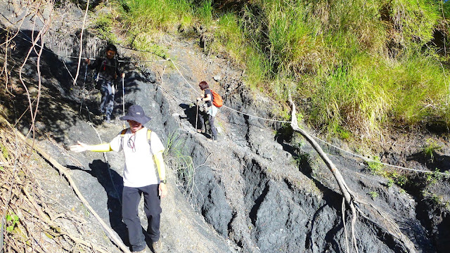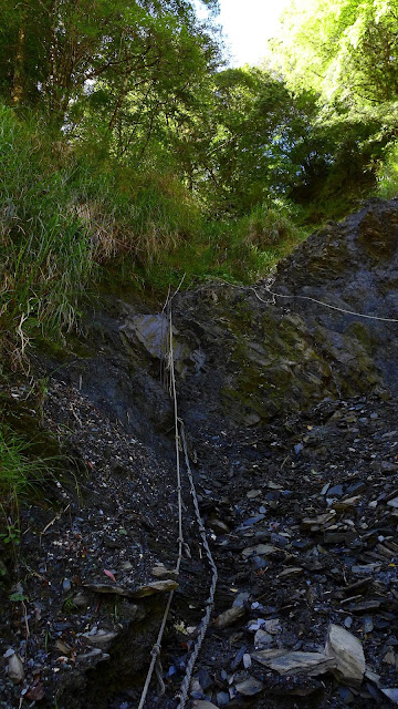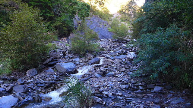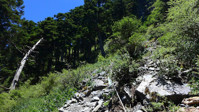 休息完前往最後水源地馬上先遇到一處大崩塌地,地鬆軟易滑動,爬上去後沿路徑到最後水源,真正的陡爬現在才要開始。