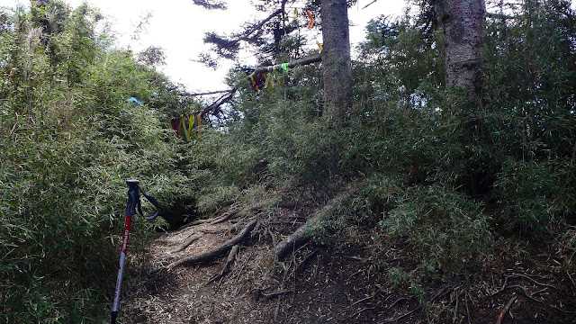整段沒view的屏風山在到山頂前這段稜線總算有視野了,不過到山頂前還是要鑽過不少茂密的箭竹,三角點位置根本是玩捉迷藏,完全沒有展望,經歷長時間奮鬥,終於登頂了。