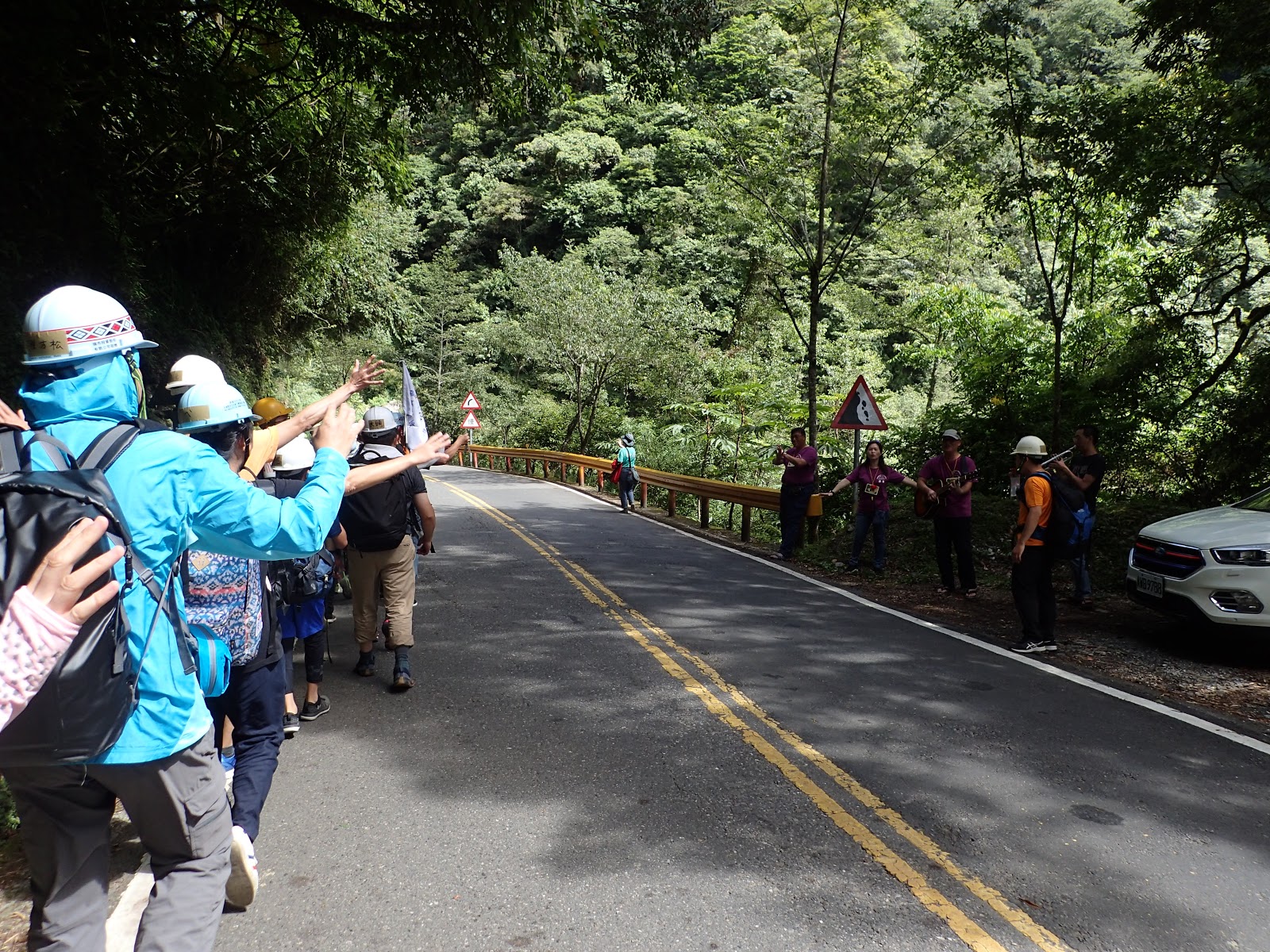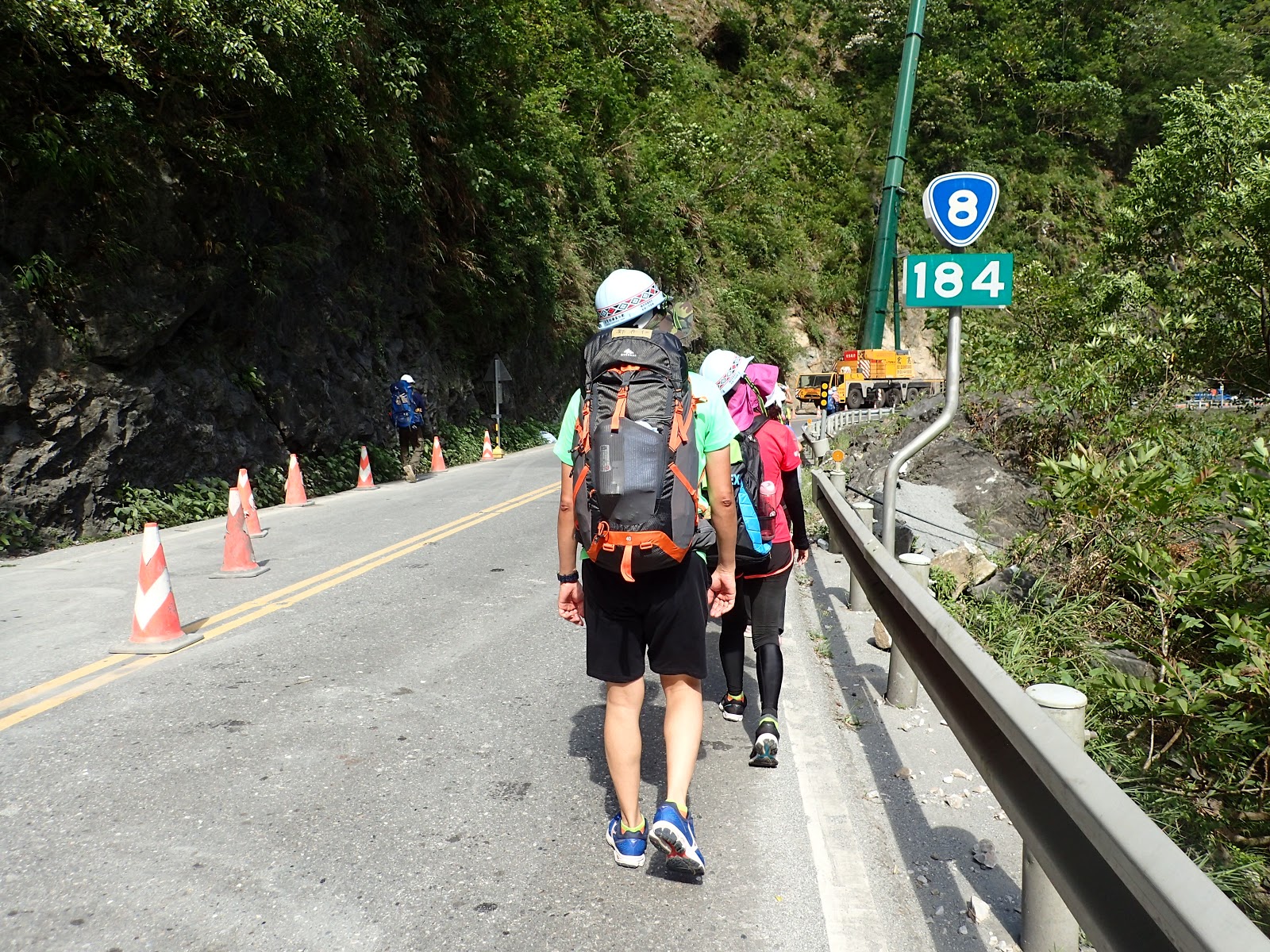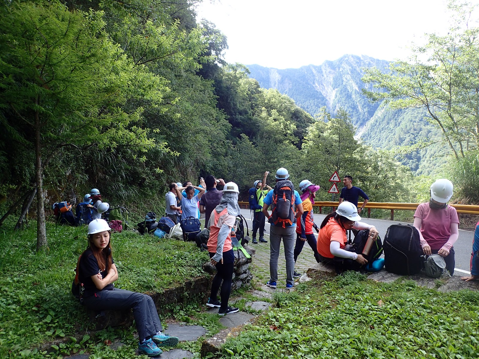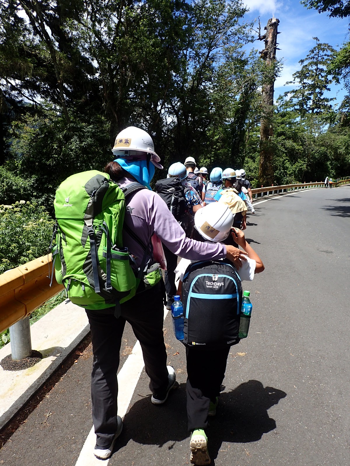 全程戴安全帽, 謹防落石, 行進中安排兩位開路官, 兩位押路官, 領隊在另外一邊, 領隊為了提升大夥士氣, 沿途高喊口號: 中橫健行, 夥伴們則對應無所不能....非常振奮人心, 慷慨激昂, 腳步也跟著輕快