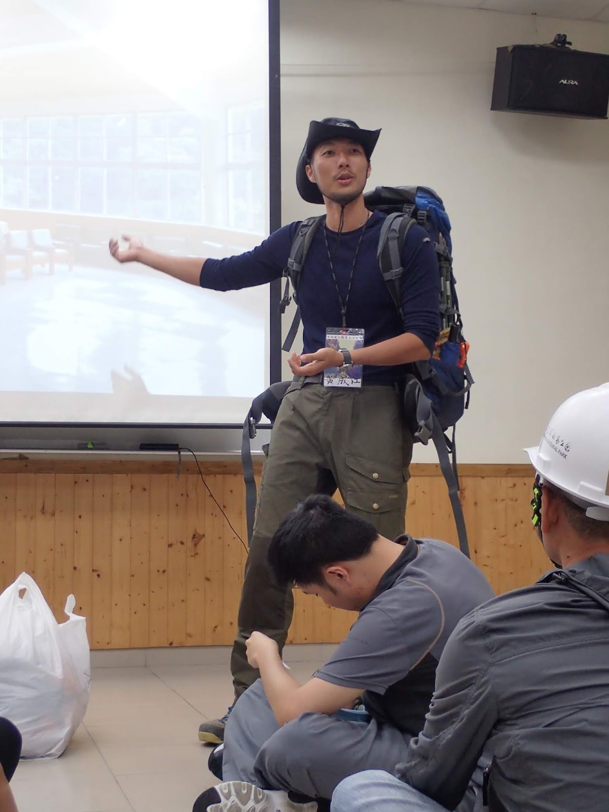 休息時, 領隊用心講解爬山脫隊迷路時要如何自救