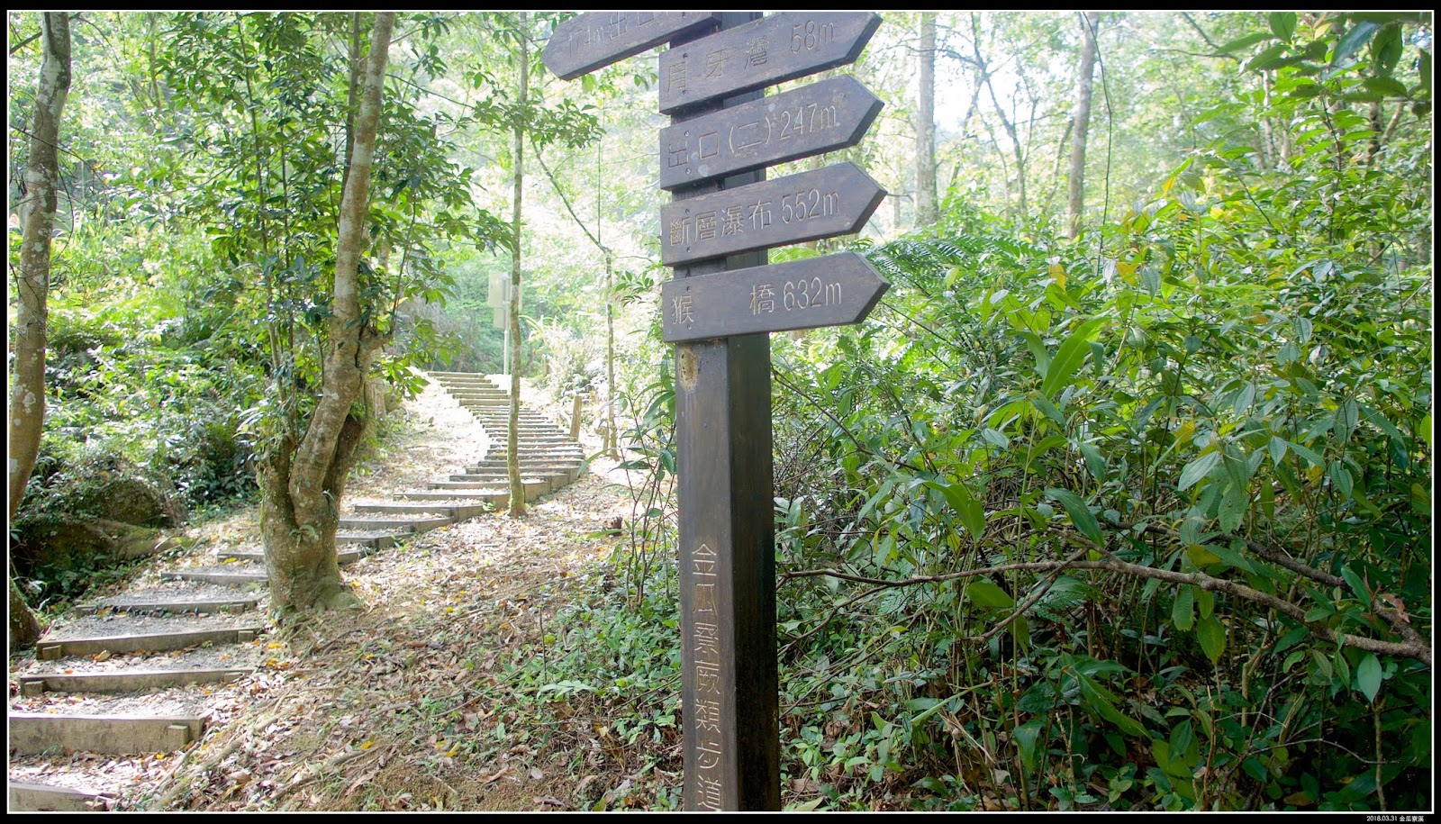 2.2公里的金瓜寮溪〖魚蕨步道〗大致分成兩段,我們只有走第二段(約1公里,備註:雖然軌跡顯示2.7公里,不過可能是軌跡亂跳),是因為不太熟悉,跟著車上登山客一起下車,他們要去右下方的倒吊子山,所以就從第二段開始走,我們也就跟著跳過第一段的〖魚蕨步道〗。