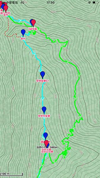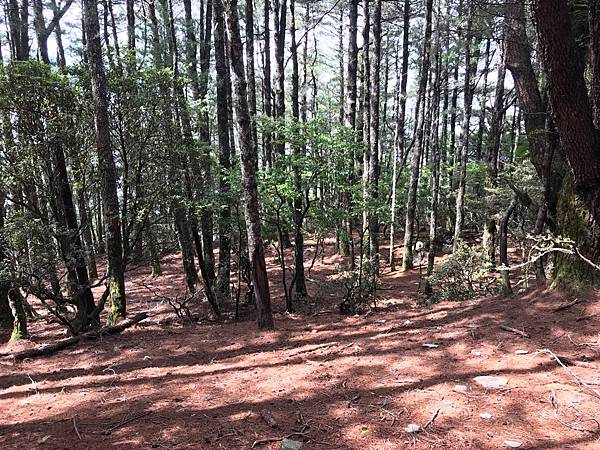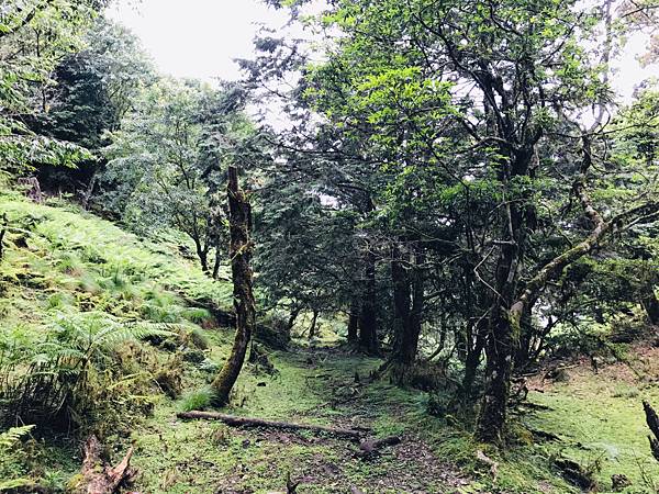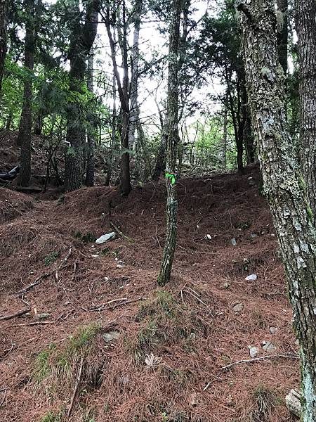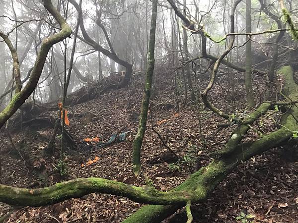 ?(綠線:我們)鞍部營地後的陡上路徑雜,在這一處花費了較長時間找路,最後上切太多而直接錯過較緩的林道營地。一路陡上2600多米,加上已走了接近10小,大家開始累了,便在治茆山前一處較找平緩的地紮營