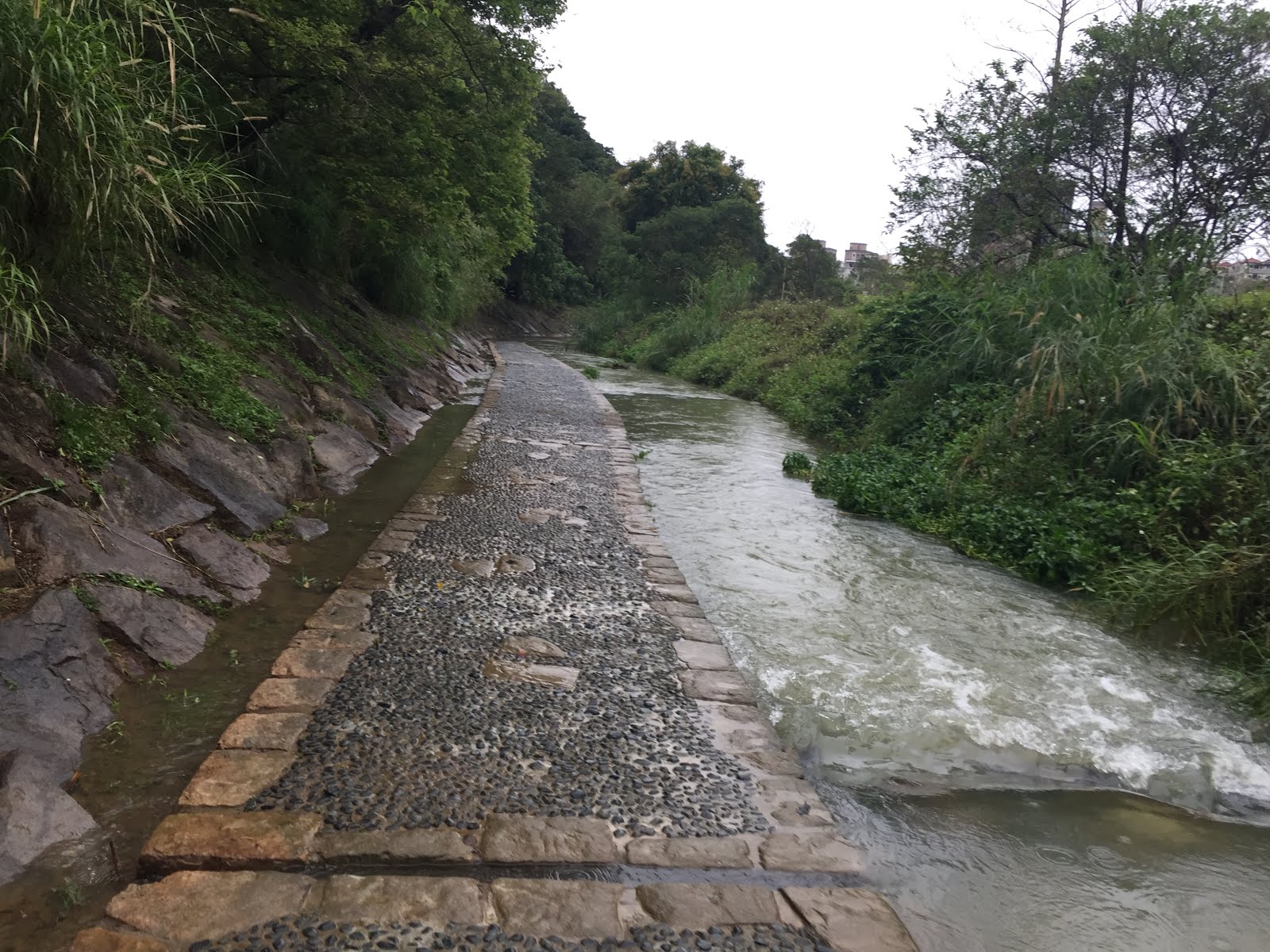 由捷運劍潭站 起登到 內湖大溝溪親水步道捷運大湖公園站,大地工程處 全程規劃為全石階步道,個人則於 劍南路 後至 金龍產業道路 前走傳統山徑,全程大約13.5公里,4小時多完成。
