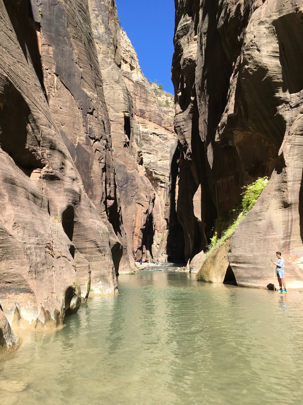 在這些遊園車可到的大都是遊客景點, 其中最著名的是The Narrows, 需要涉溪走在峽谷之中, 一般來說不太需要淺水衣或溯溪鞋之類的裝備, 穿著一般的衣服鞋子就可以下去玩水, 除非是比較怕冷的人才可能有需要穿著潛水衣, 這些裝備在Springdale都可租的到, 整套印象中整套是40美金, 不過我個人覺得不需要所以可以省下來, The Narrows有兩種走法, 一種是過夜行程, 大約兩天一夜可以走完, 需要申請permit, 要背負帳篷等過夜裝備還有炊煮裝備, 申請permit的同時會發給糞便袋, 因為The Narrows的峽谷地形沒有地方挖貓洞, 而且都走在河道旁邊, 糞便袋是必須要使用的東西, 不然大便水就會流到那些純粹來玩的觀光客身上, 全程也禁止生火保護環境, 走兩天一夜的The Narrows是A進B出的行程, 去程需要自己跟接駁公司預約時間, 每天都有固定的出車時間, 遊客中心會提供相關的資料, 接駁公司也會自動並車, 所以只需要跟接駁公司確定上車時間還有人數即可, 終點是園區遊園車能抵達的地方, 所以回程不須安排接駁, 第二種走法是不需要申請permit, 搭乘園區的遊園車來到riverside, 這裡就是第一種走法的結束點, 從這邊開始走, 到中間點折返, 沒有申請permit的人不能通過中間點, 我是走第二種不需要permit的行程, 由於是在峽谷中的溯溪, 所以要非常注意天氣型態, 因為只要一下雨峽谷中的溪水就會暴漲, 英文叫做flash flood, 暴漲後是非常危險的, 身在峽谷內完全沒有地方可以躲, 一定會被水沖走, 很容易就有致命的危險, 如果不知道如何看天氣也沒有關係, 在遊客中心內就會有今天flash flood的危險指數可供參考, riverside也有告示牌提醒遊客今天的危險指數