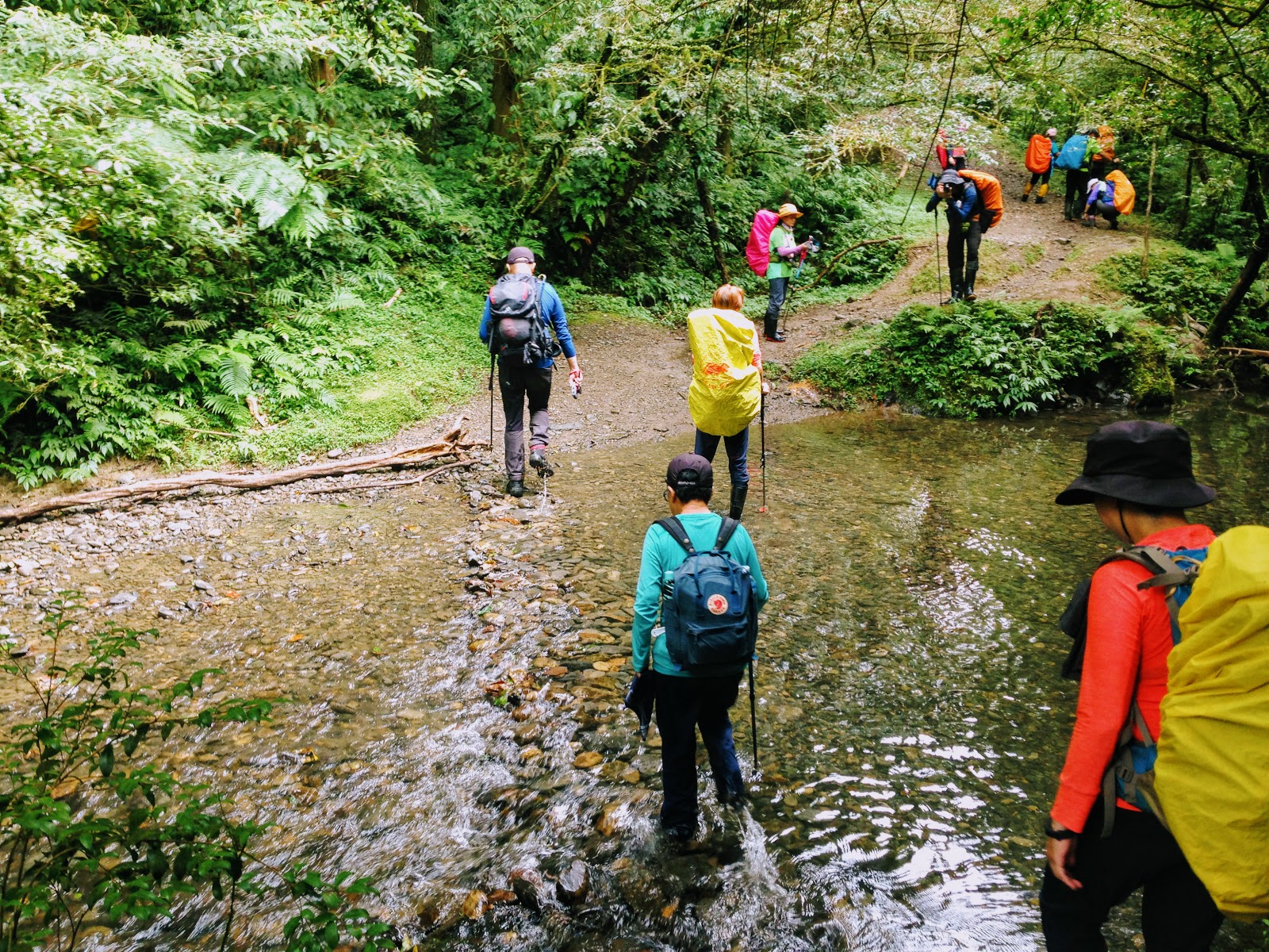 以長時間行進來說,應該要穿登山鞋比較不吃力,尤其我個人穿雨鞋走柏油路很容易腳痛。然而途中要三次渡溪,這時候登山鞋就比較麻煩。前幾天剛好下雨,溪水大多在腳踝以上、膝蓋以下,所以穿雨鞋可以通行,但穿登山鞋(或是水量高過雨鞋時)就需要脫掉鞋子赤腳溯溪了。
