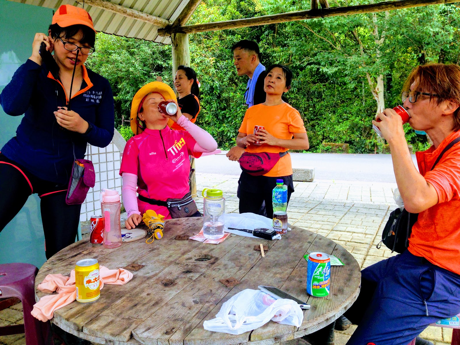 我們一群人立刻就一人拿一罐飲料一支冰棒在這個涼亭提供的休息區坐下來嗑。